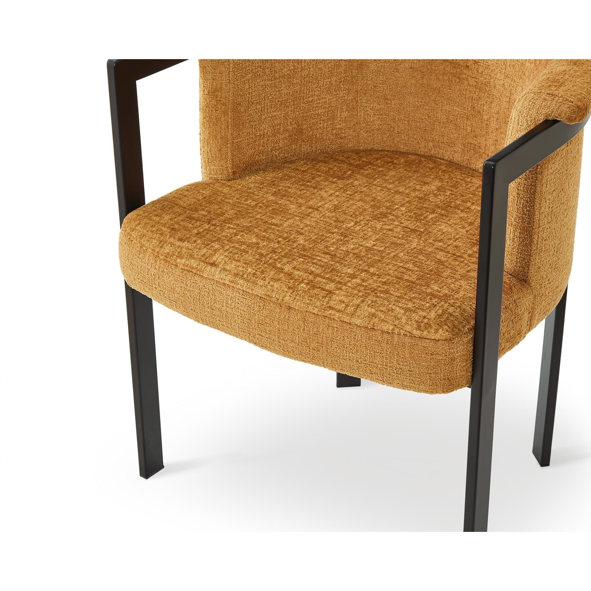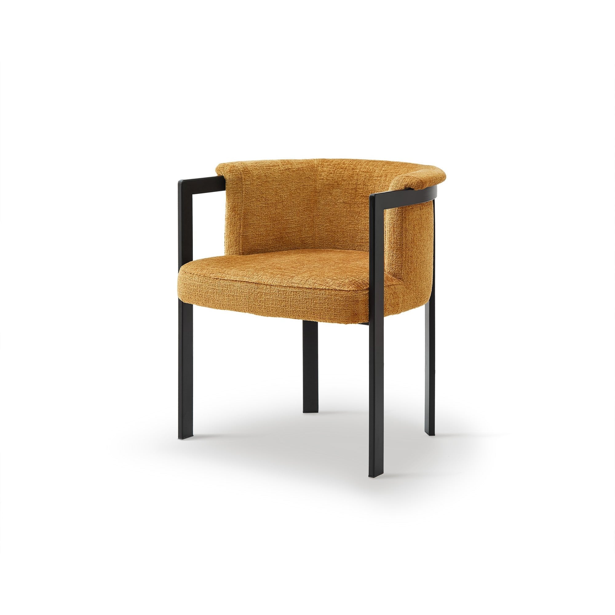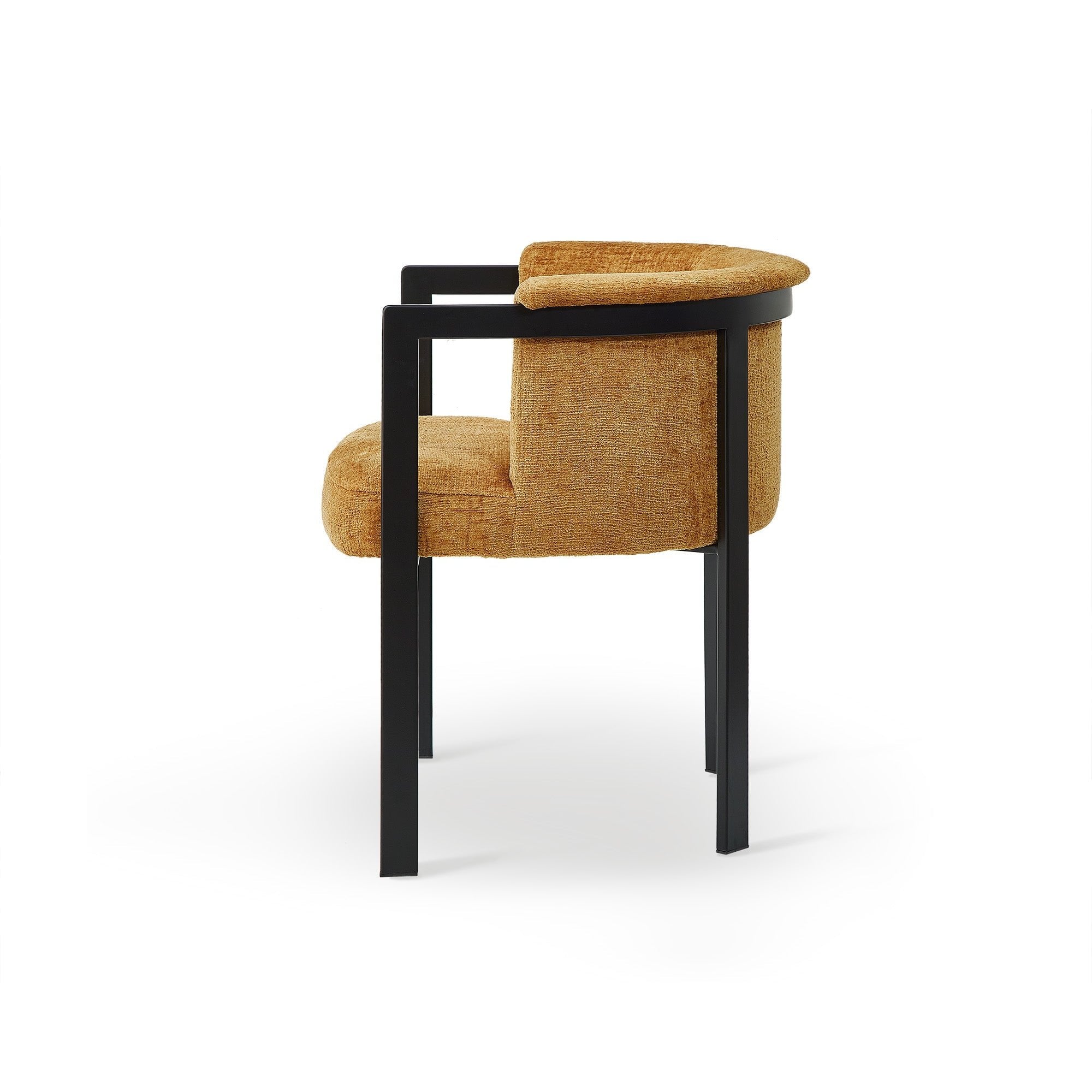 Elevate your dining experience with the Como Dining Chair in Bennett Mustard. Its striking blend of orange, mustard, and ochre hues adds warmth and character, making it a focal point in any dining area. Crafted with durable matt black steel legs and plush upholstery, this chair seamlessly combines comfort and style, perfect for both homes and restaurants.