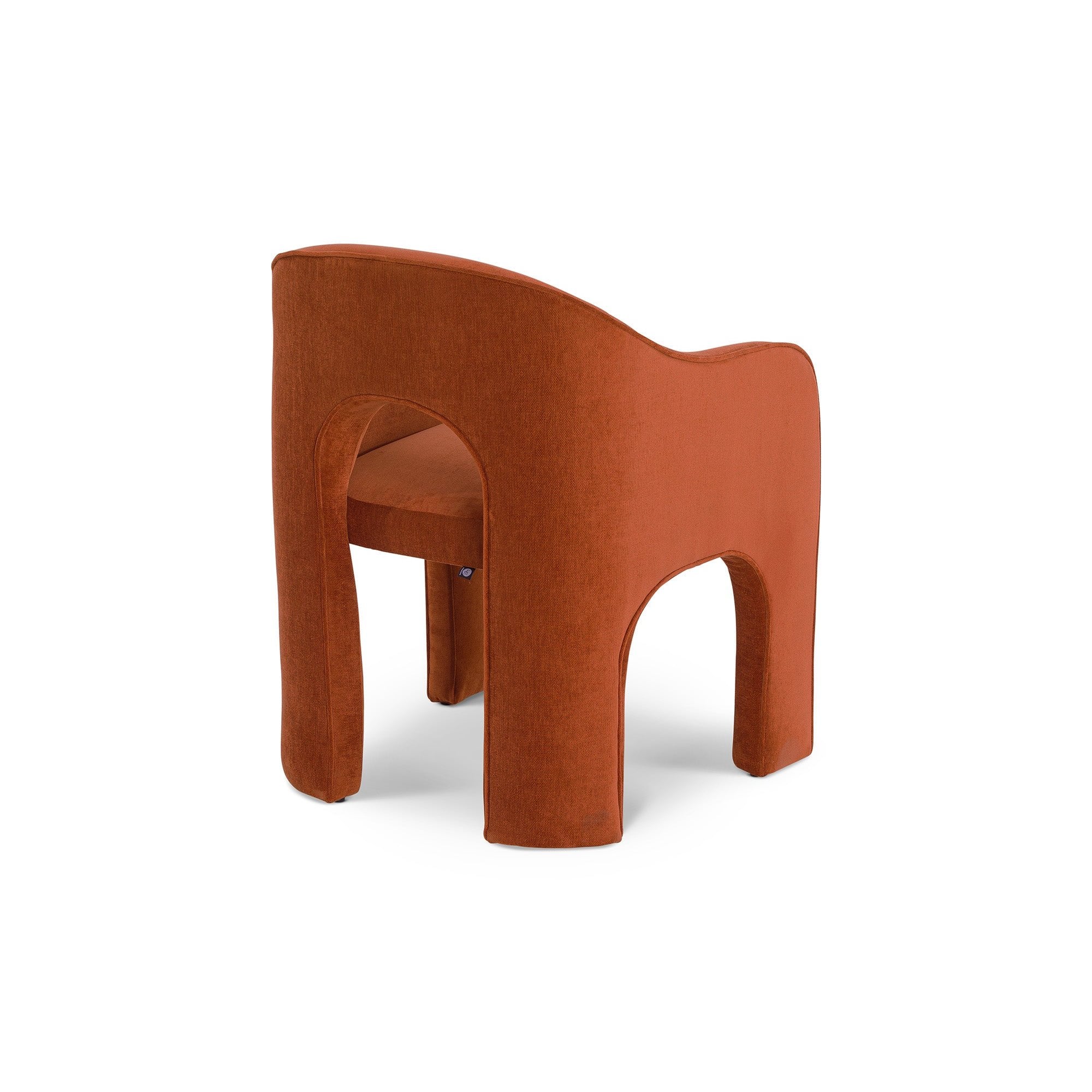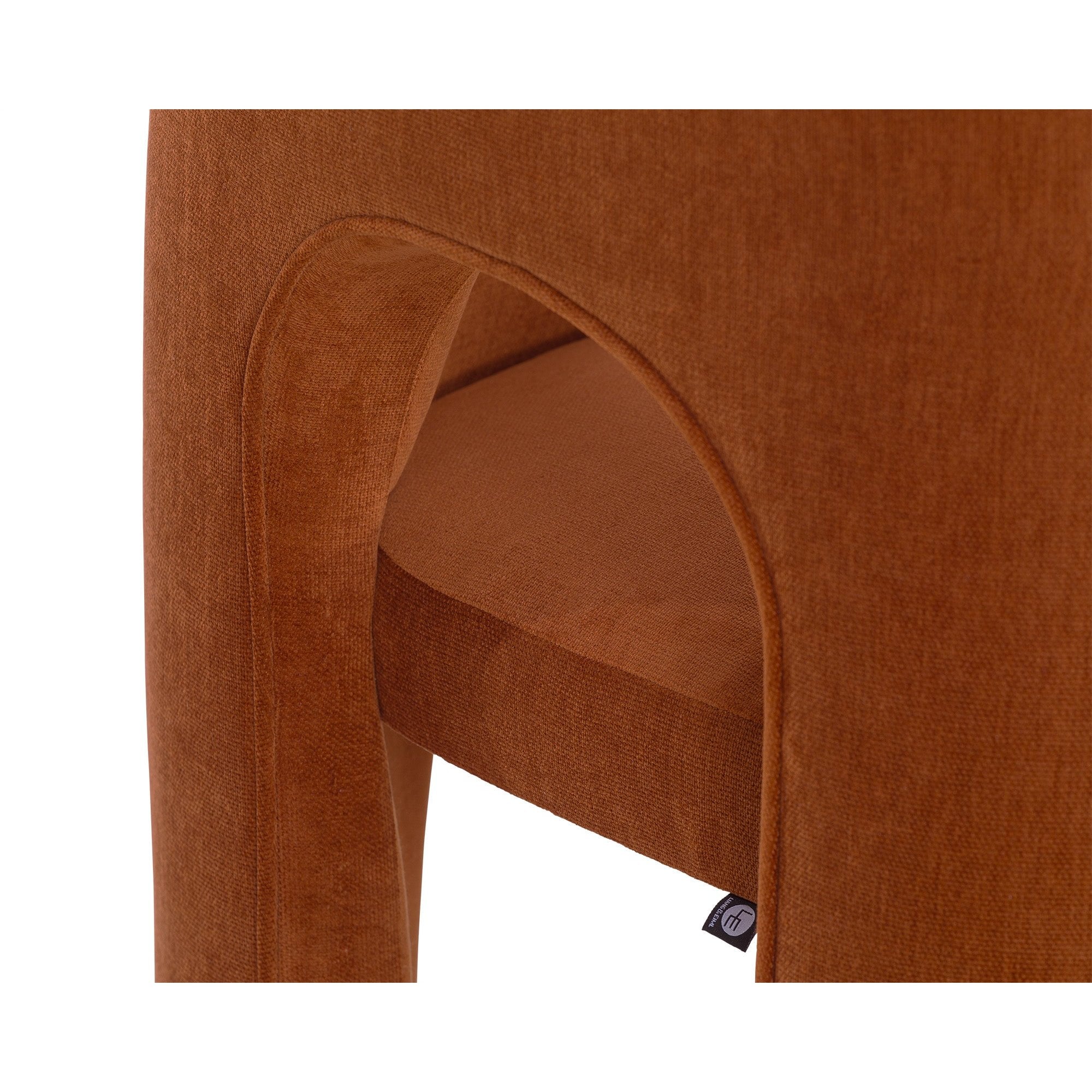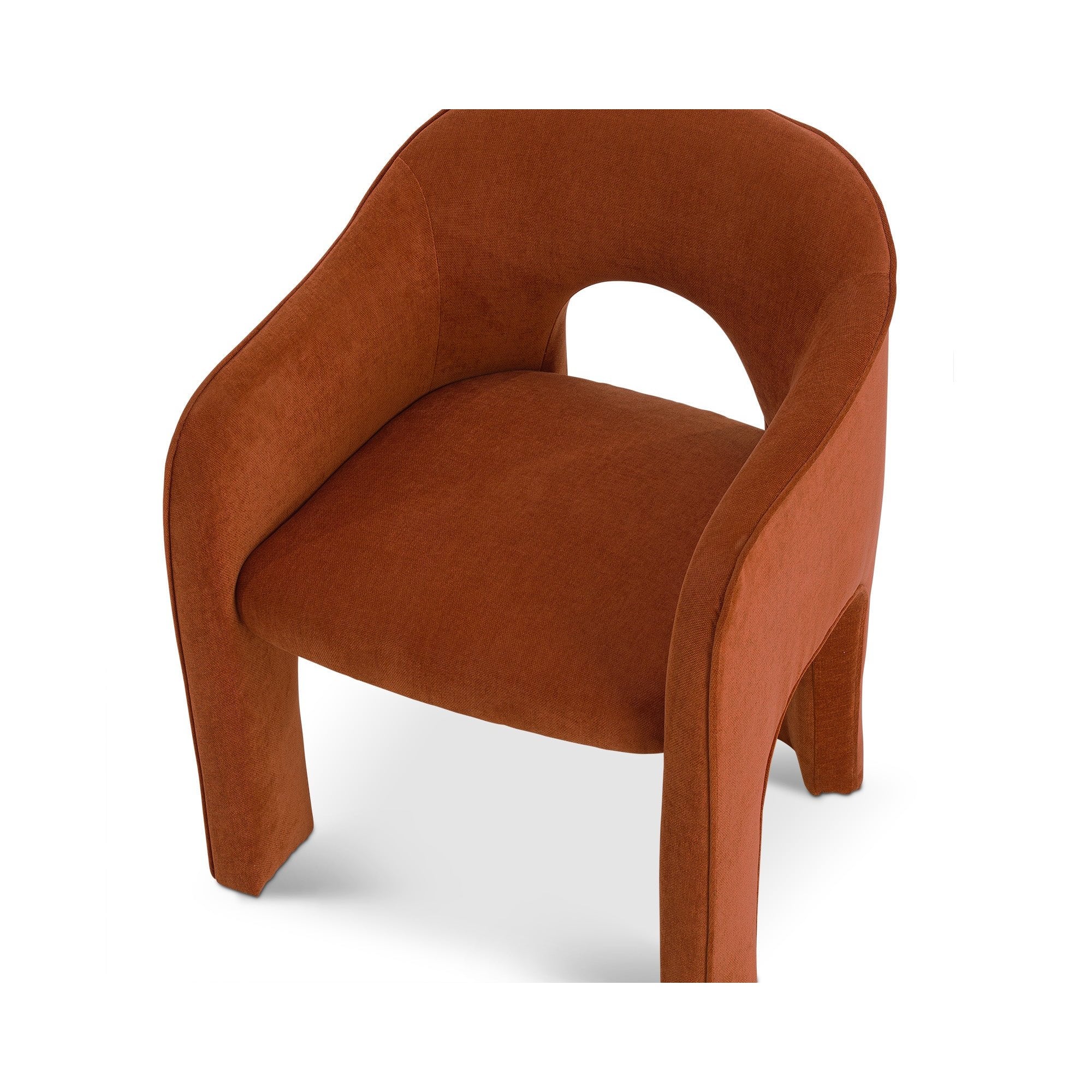 Elevate your dining area with the Kara Dining Chair in striking Morgan Sienna Chenille. Its rich rust-hued upholstery combines stunning aesthetics with comfort, featuring plush armrests and a gracefully integrated backrest. Perfectly crafted for both intimate family dinners and lavish entertaining, this chair complements various styles while making a bold statement. Also available in Morgan Ochre and Bilma Sand Boucle.
