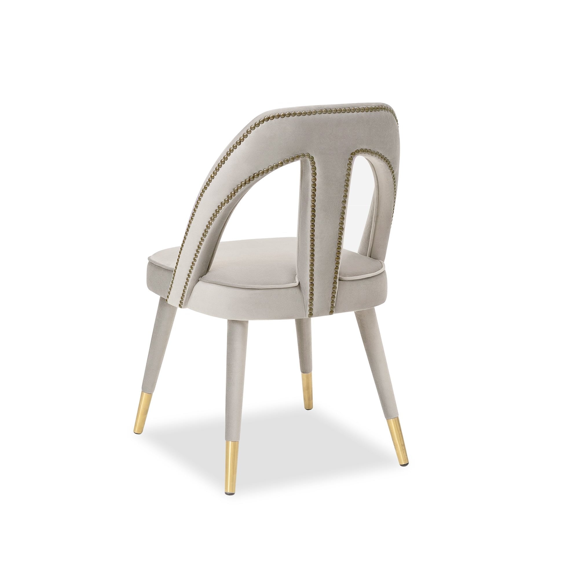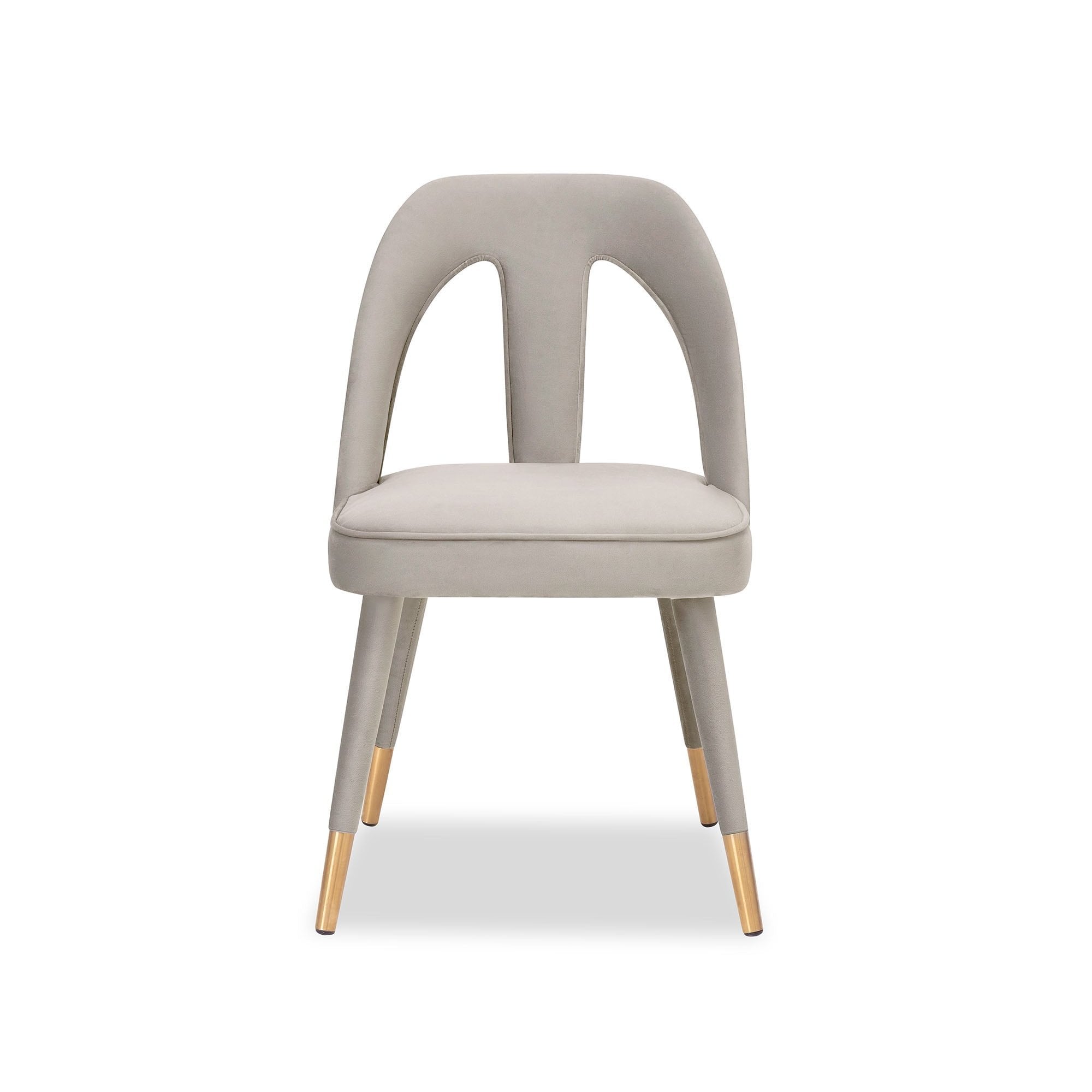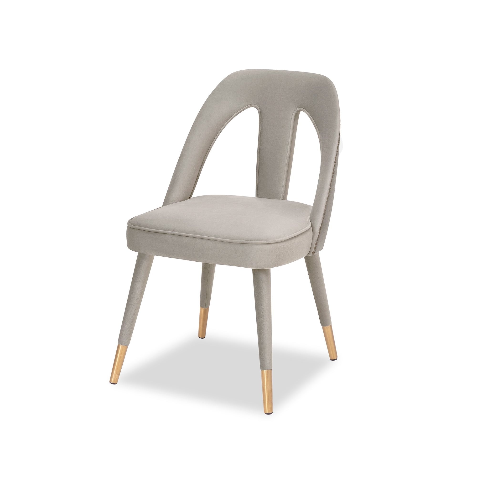 Elevate your space with the Pigalle Chair in Kaster Light Grey Velvet, featuring elegant gold cappings on its tapered legs. The luxurious upholstery and cut-out backrest deliver sophistication and comfort, making it a perfect seating option for refined interiors. A chic addition to dining or lounge areas.