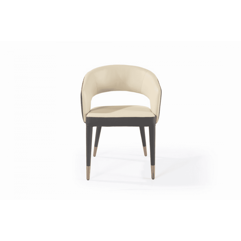 The Lydia Dining Arm Chair blends classical elegance with contemporary refinement. Its gently rounded shape hugs the body, while the dual-tone palette adds depth and nuance. Cream tones create softness and warmth, while the contrasting shell introduces a cooler, architectural note. This is a chair that balances tradition and modernity with perfect precision. Subtle rose-gold detailing at the feet gives Lydia a final flourish — a barely-there touch of glamour that elevates the piece even further. It works beautifully in fine dining settings, luxury hospitality environments, or as a refined accent piece in residential interiors.