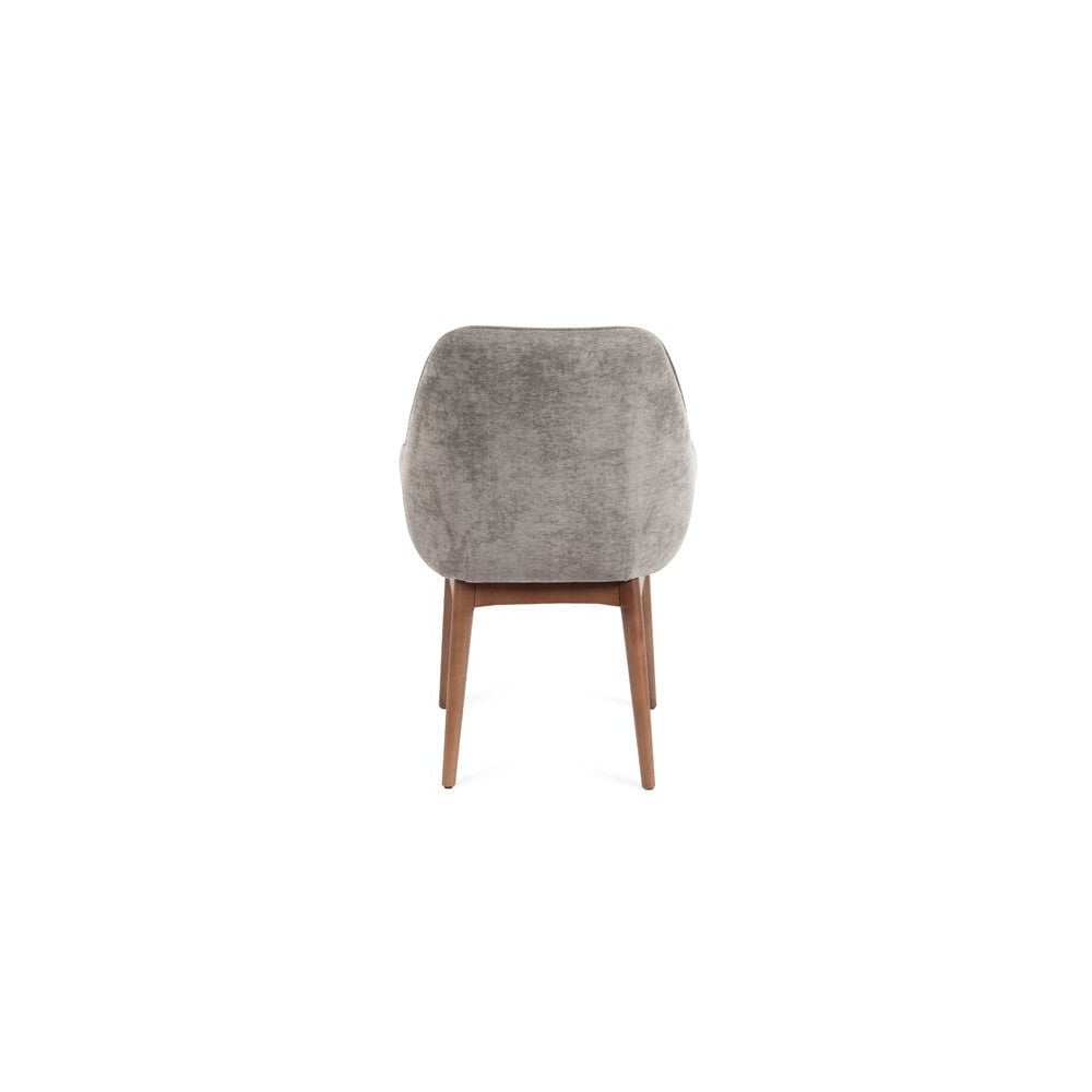 Upholstered in Giselle Seamist fabric, this chair is incredibly comfortable and stylish. Its solid birch frame construction and legs detailed in a smooth walnut finish make it a sturdy and reliable piece of furniture. The curved comfort of its backrest and armrests provide a luxurious experience, while its graceful lines add an elegant touch to any dining room décor.
