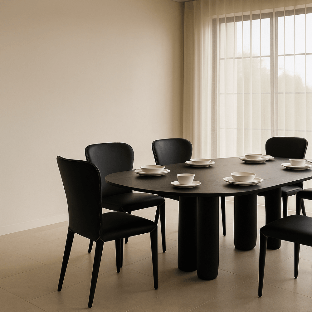 The Sarzana Dining Chair epitomises chic sophistication with its understated yet impactful design. Cloaked in sleek black upholstery, this fully upholstered chair boasts an aura of contemporary elegance, while its white stitching details provide a refined contrast that highlights its simplistic beauty.