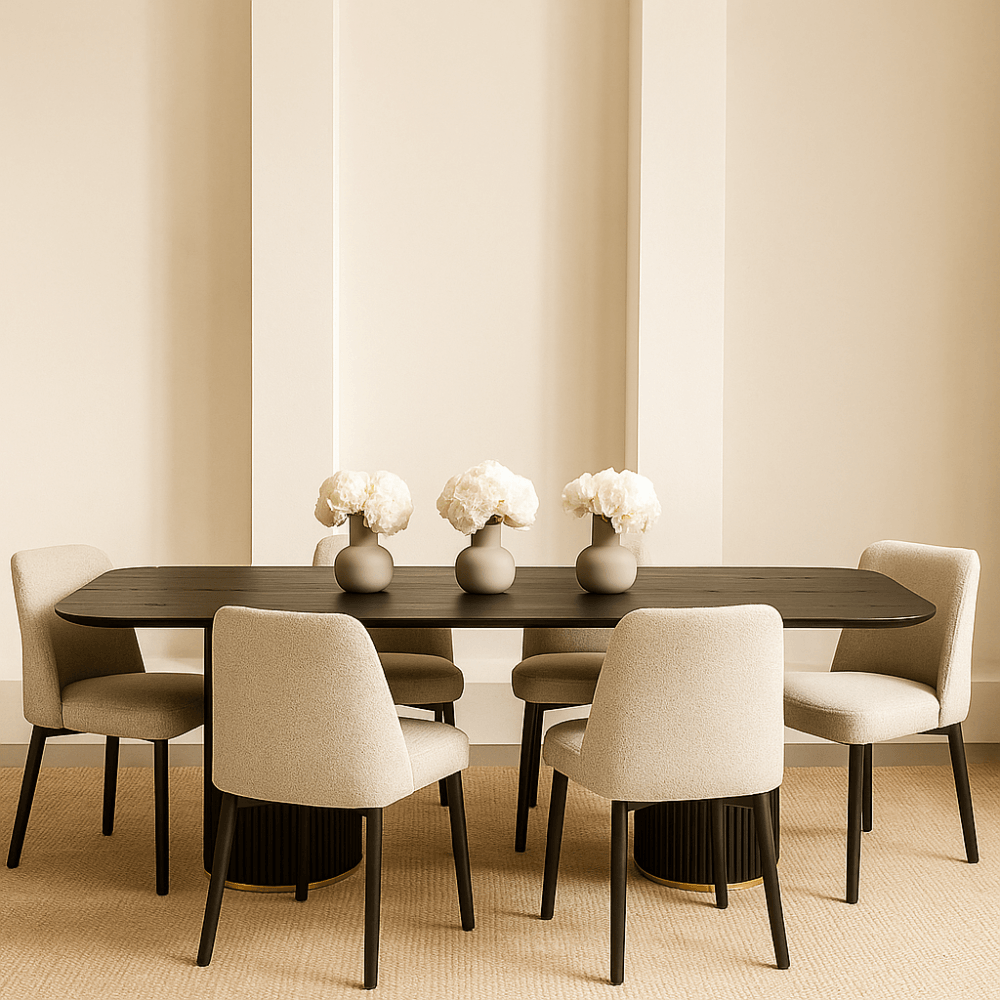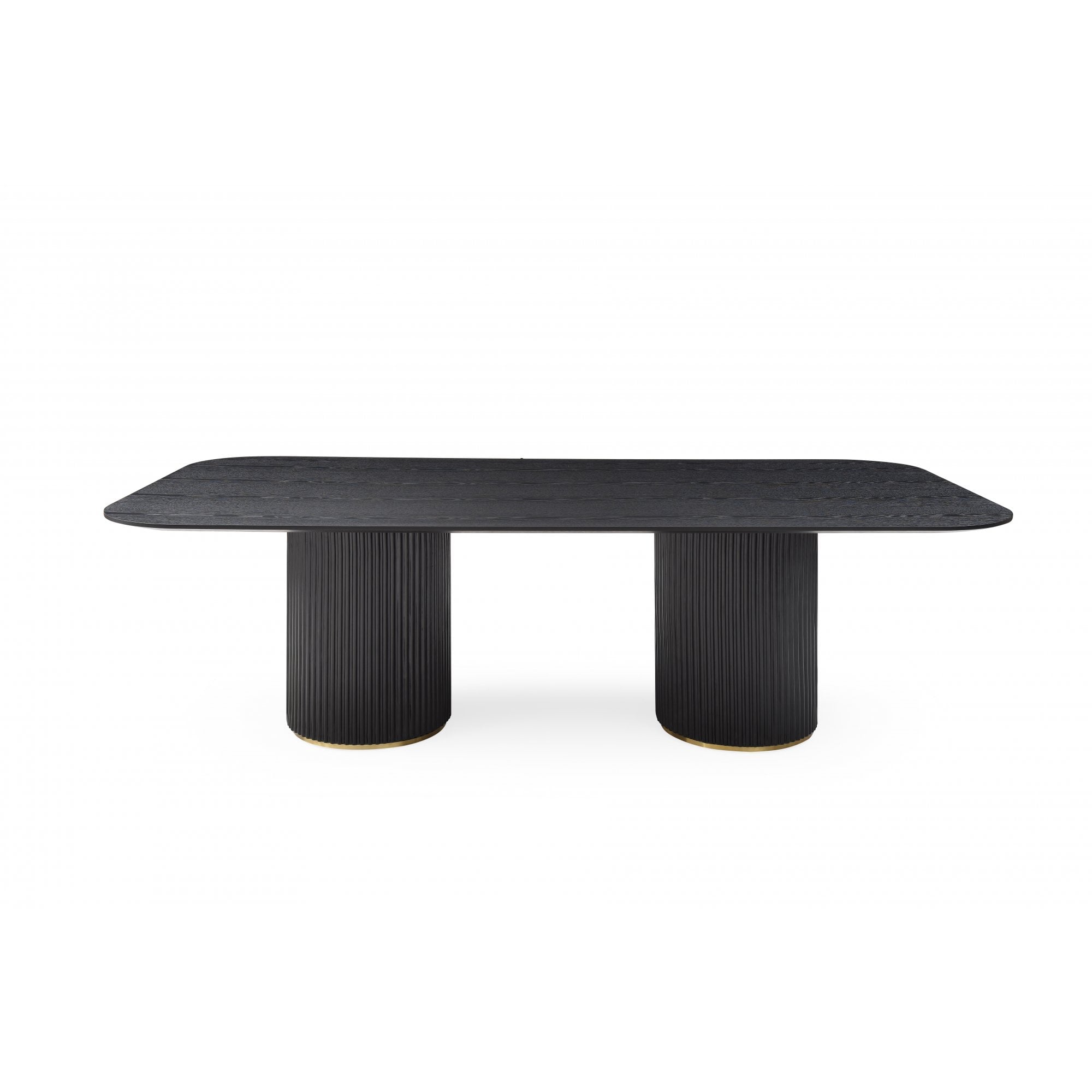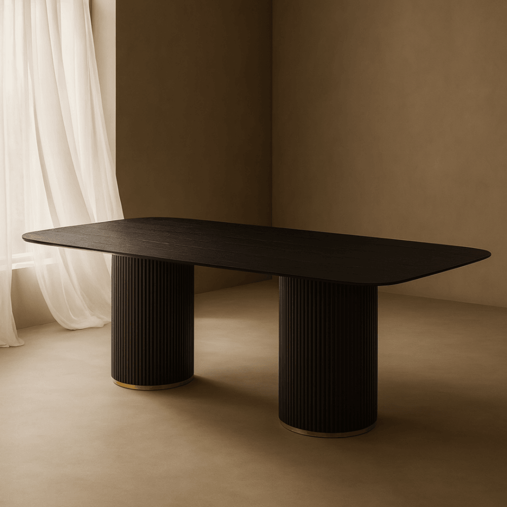 Make a bold statement in your dining space with the Lantine 240 Dining Table. This exquisite piece brings a touch of sophistication and chic to any room. With its sleek timber veneer top in black oak and a striking matte black lacquered ribbed detail twin pedestal base, this table is a true masterpiece that will leave your guests in awe.