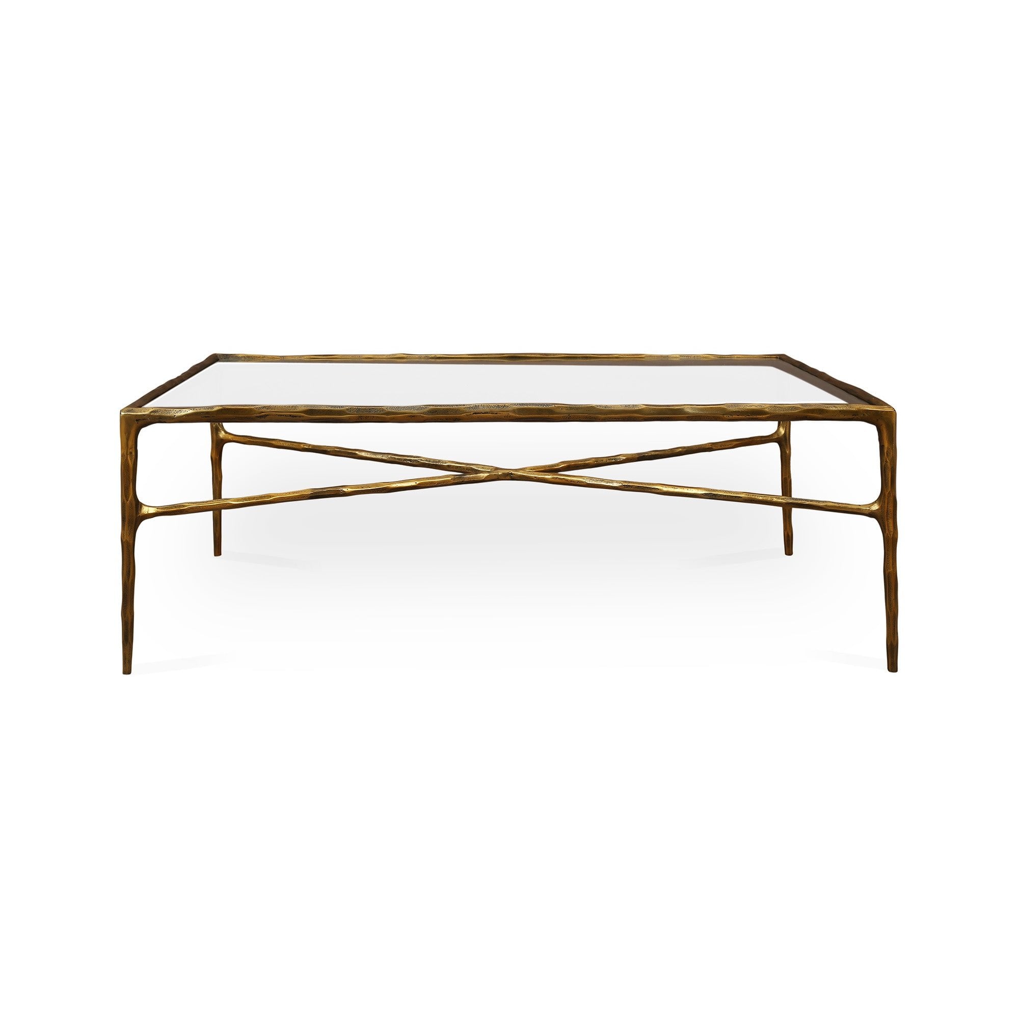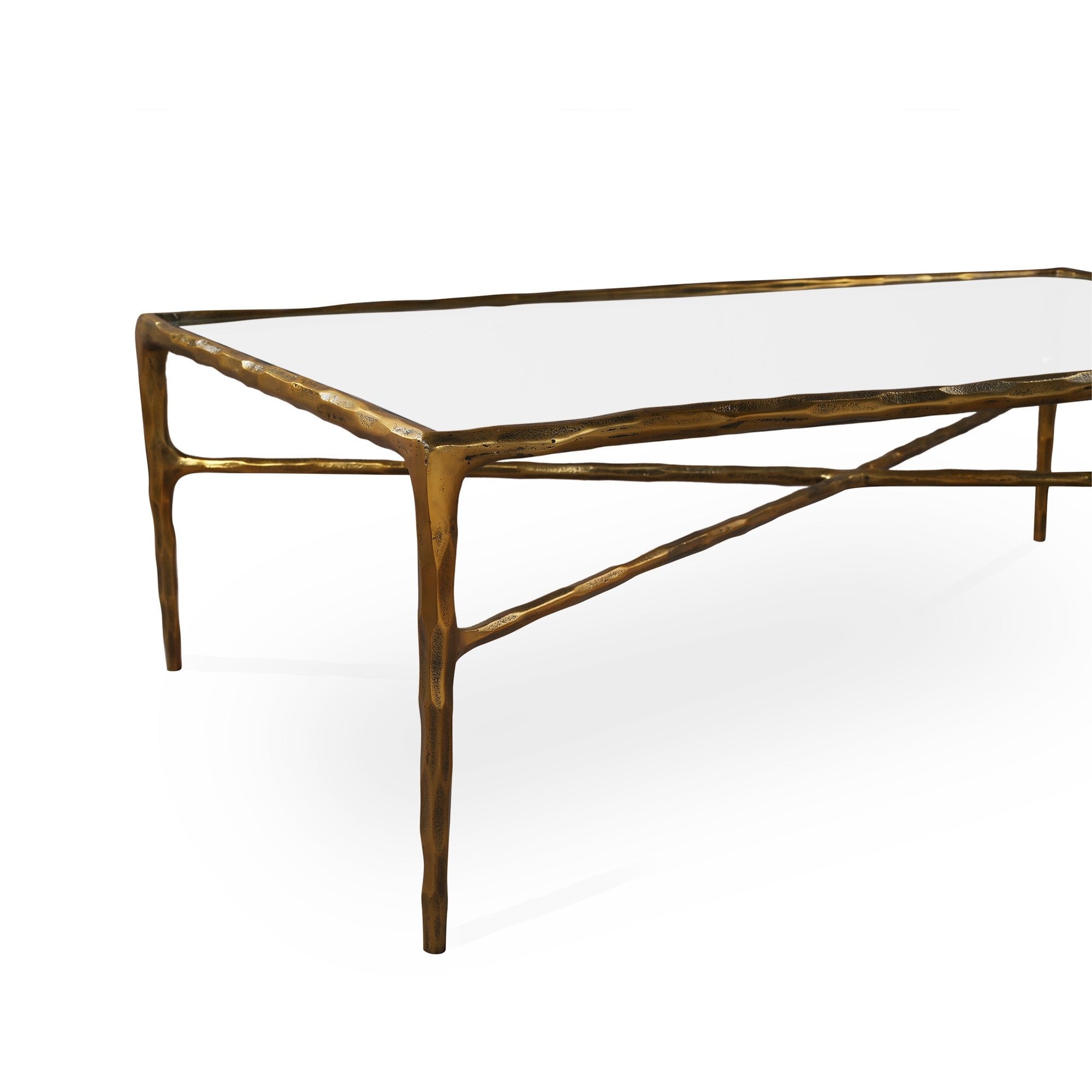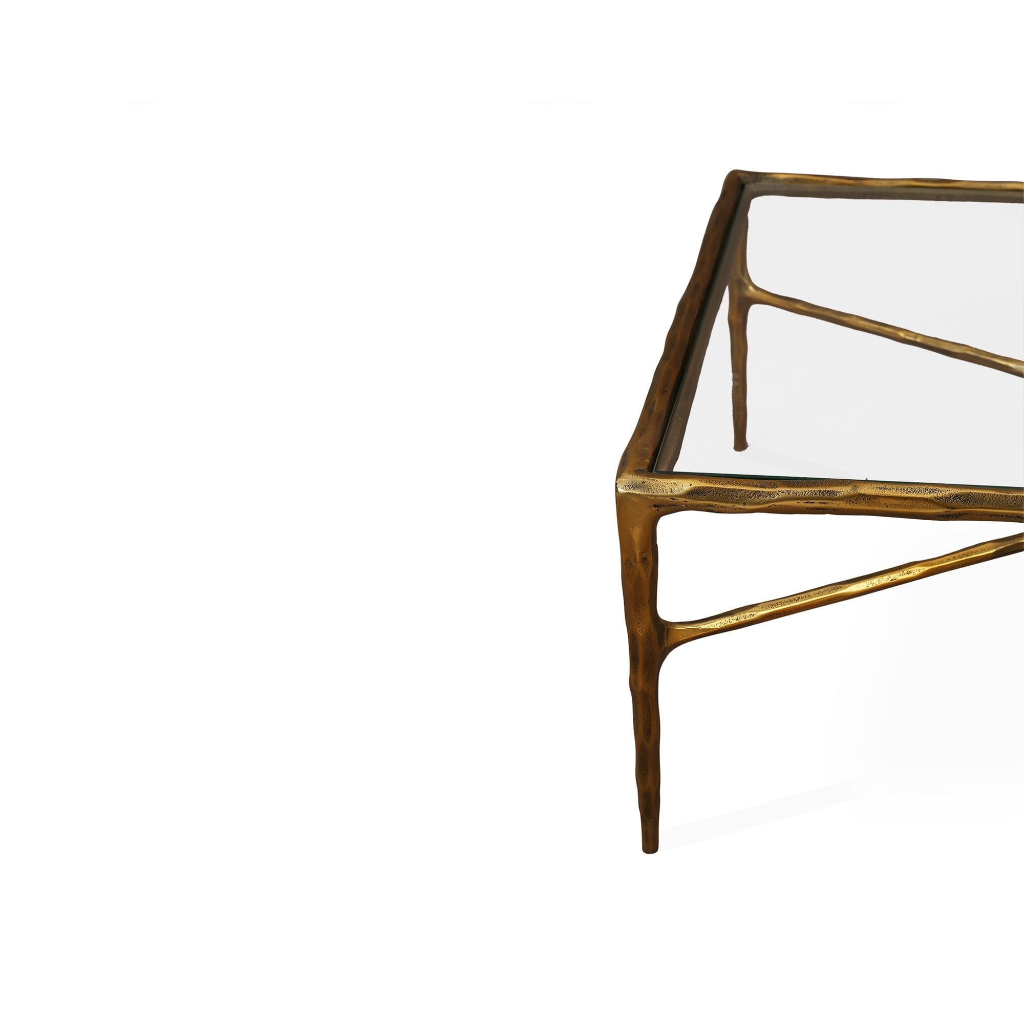 Hand-textured antique brass frames a floating pane of clear glass. Sculptural legs add architectural flair without overpowering, ideal for spaces where lightness meets material depth.