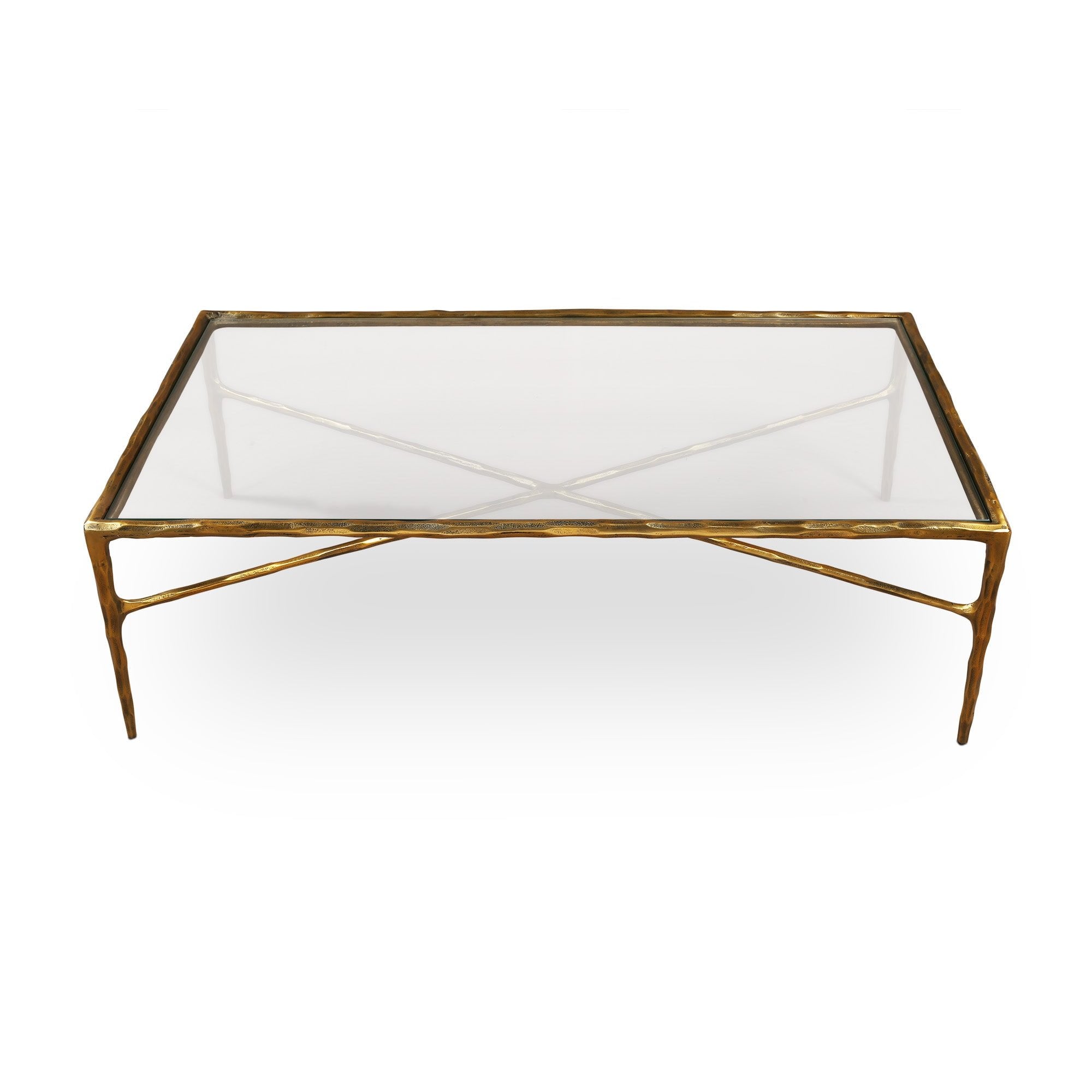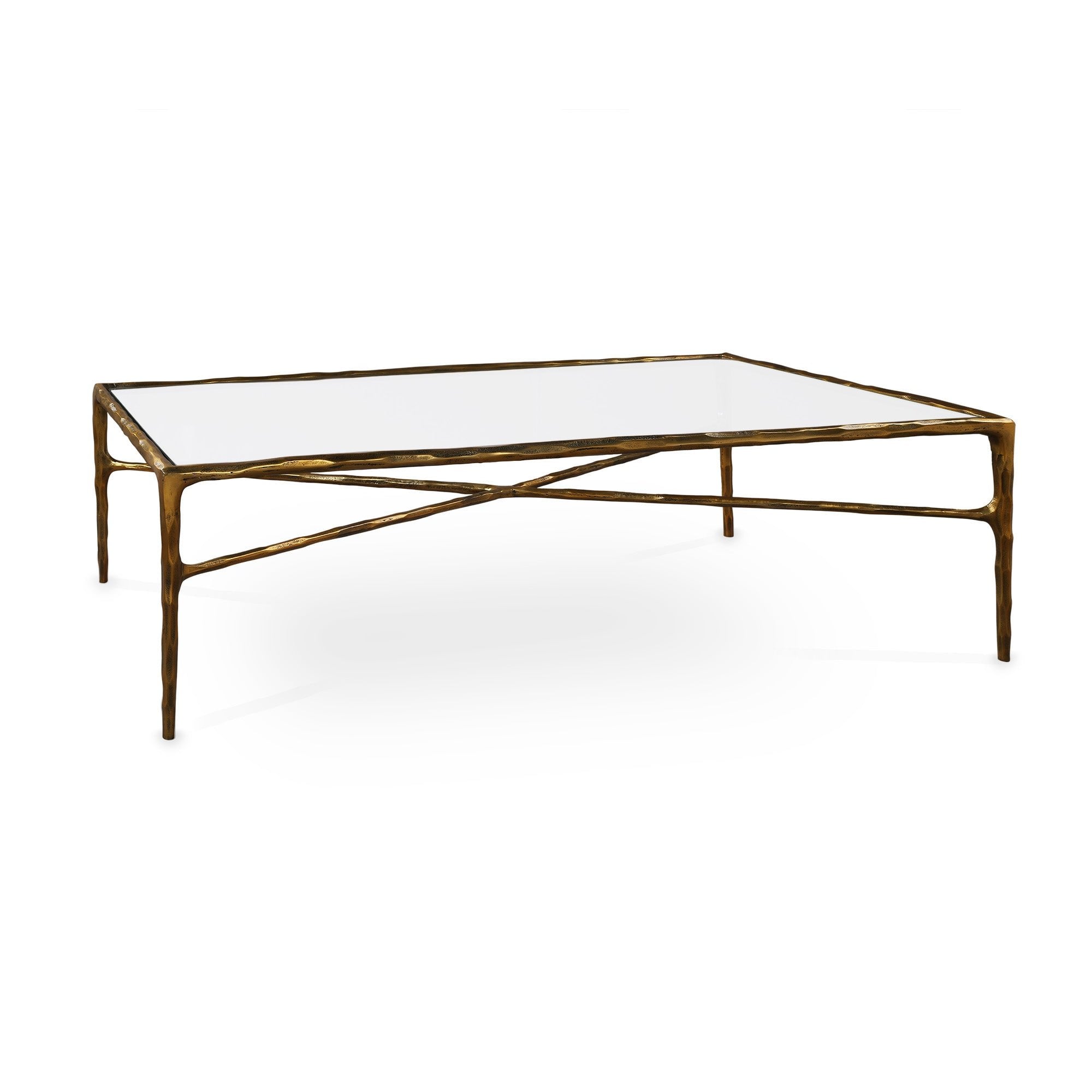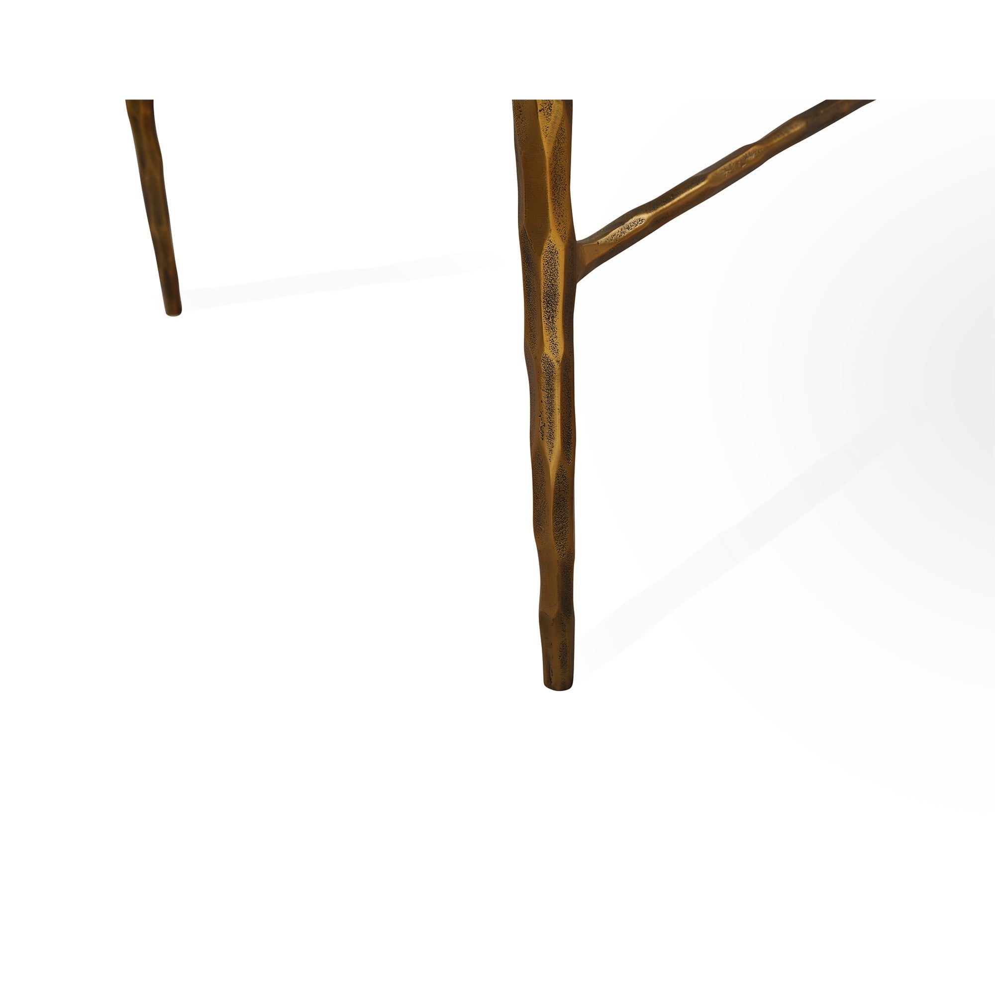 Hand-textured antique brass frames a floating pane of clear glass. Sculptural legs add architectural flair without overpowering, ideal for spaces where lightness meets material depth.
