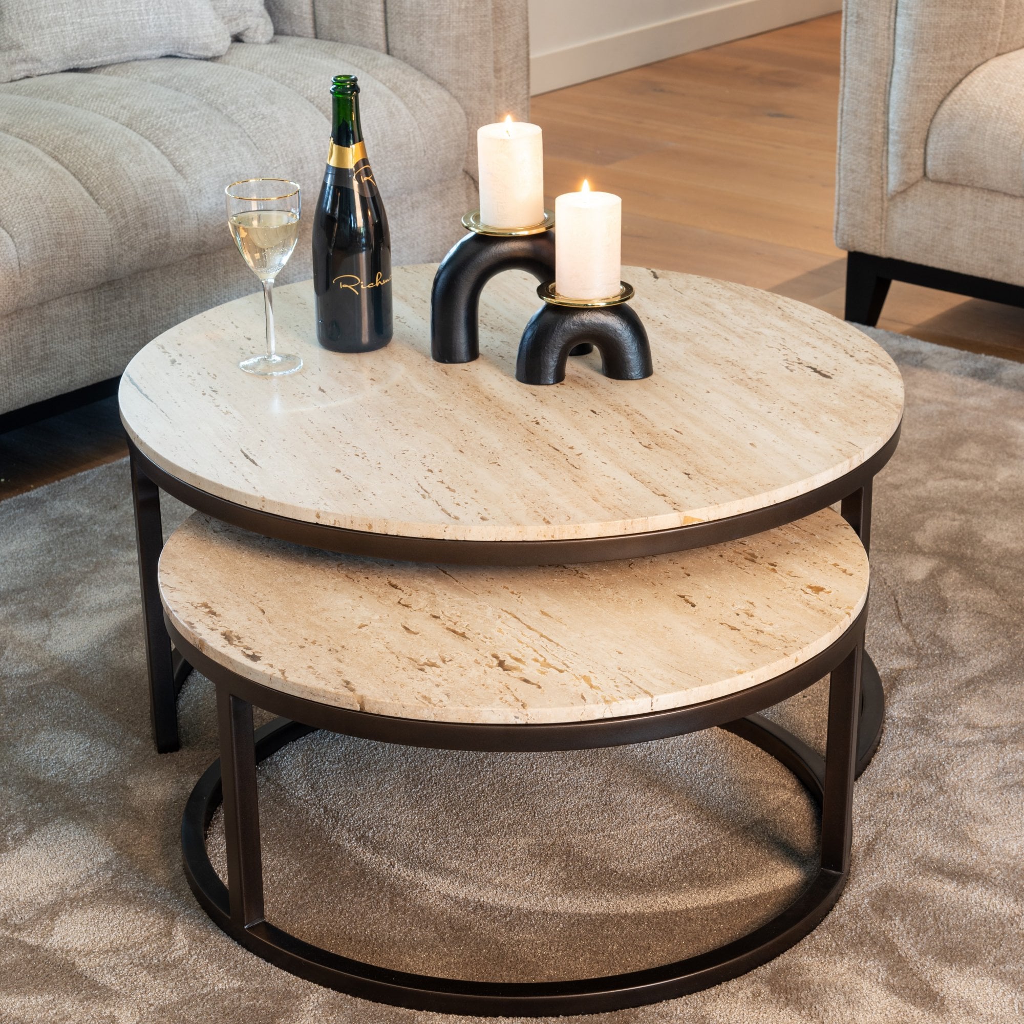 Featuring sleek iron frames, these tables showcase a blend of sharp lines and smooth curves, finished in a rich dark bronze for a sophisticated touch. The sand-colored travertine tops add a natural elegance, seamlessly enhancing any room's ambiance.