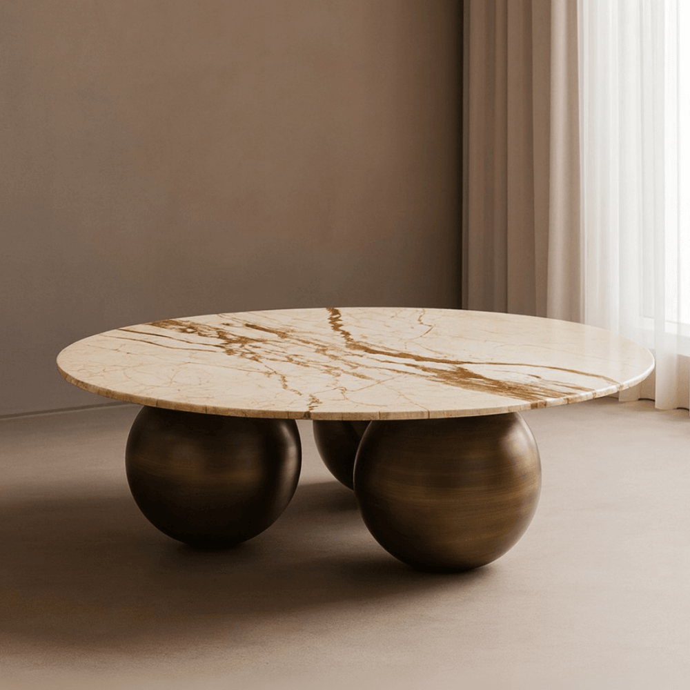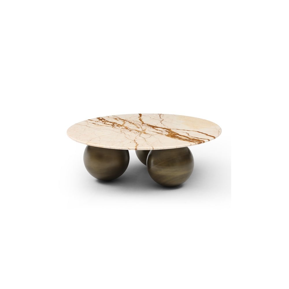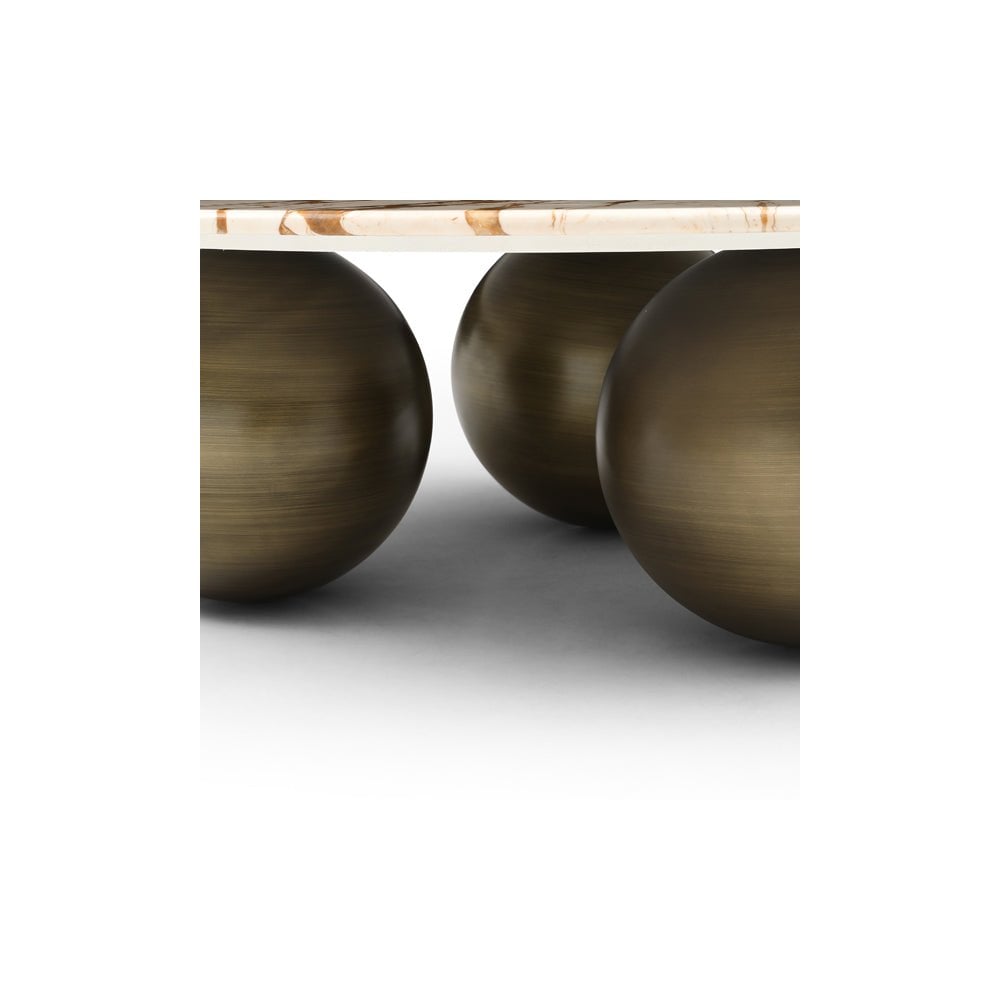 The Crescent Coffee Table redefines elegance, boasting a striking Sofitel gold gloss marble top that exudes opulence. Its design is nothing short of a statement, with a trio of bronze ball bases that not only provide sturdy support but also add a touch of uniqueness to its composition. This table's captivating blend of materials and bold configuration makes it an eye-catching centerpiece, radiating an interesting allure that captivates attention. The marriage of opulence and originality in the Crescent Coffee Table makes it an unparalleled addition to any living space, effortlessly embodying sophistication and artistic intrigue.