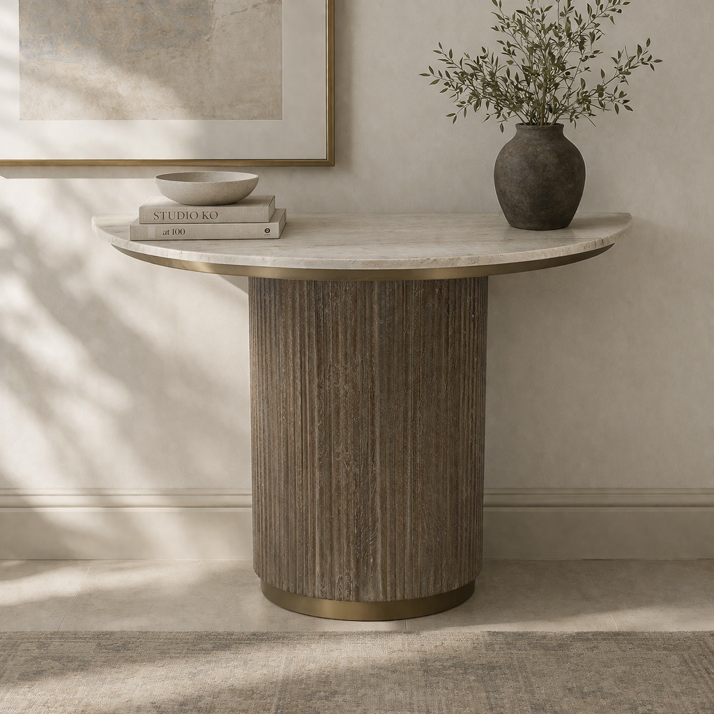 The half moon shape of the Maigue Console Table makes it perfect for fitting flush against a wall, to create a statement hallway table or charming living room accent table. With an elegant brass trim to finish off its stylish look.