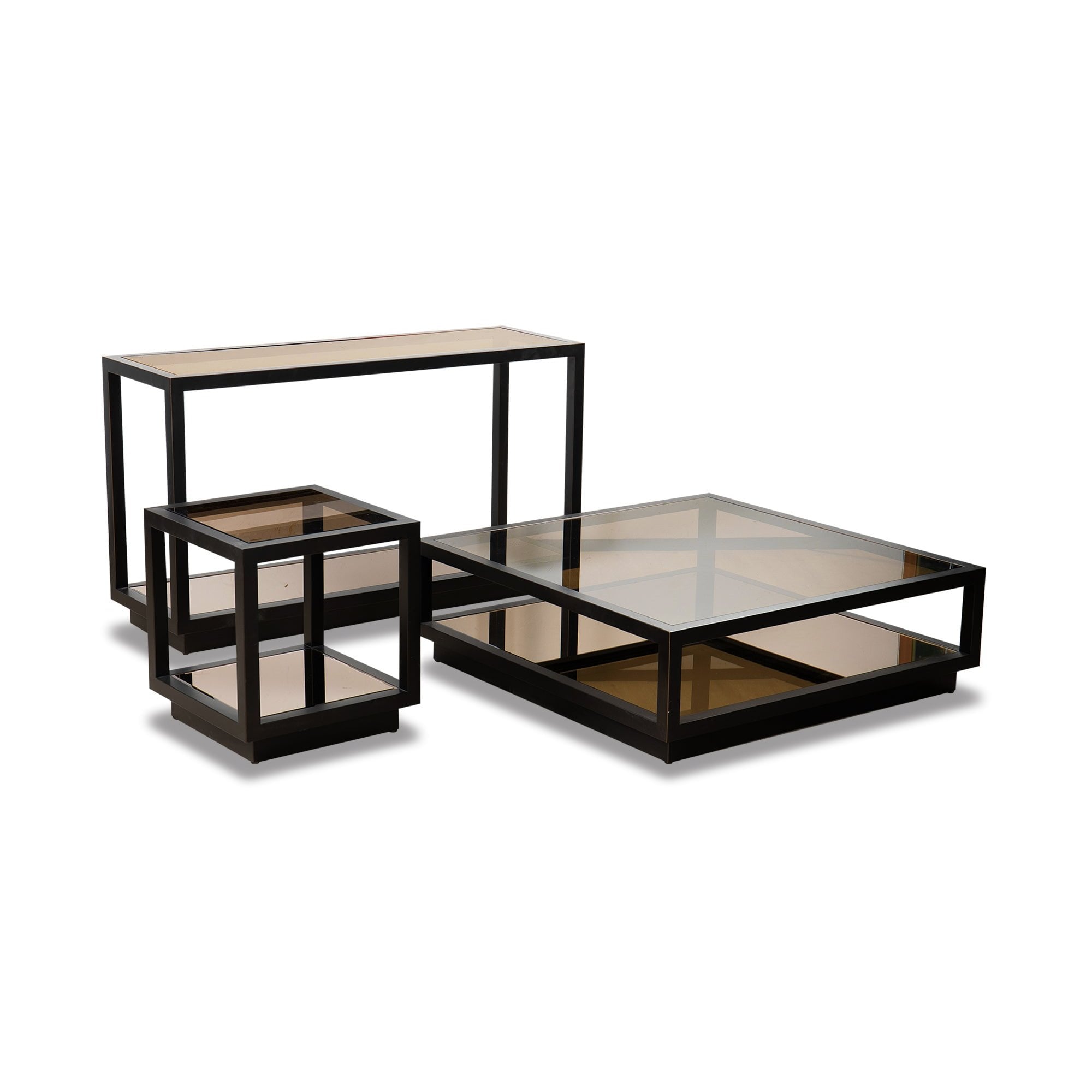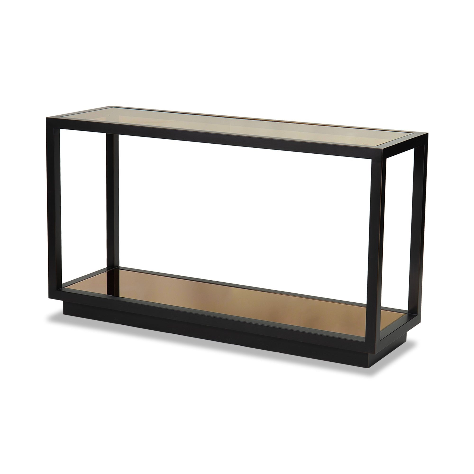 The Mali Console Table merges timeless elegance with modern artistry, featuring antique bronze finish metal, bronze-tinted glass, and a stylish beveled mirror undertier. This sophisticated design captures the essence of Cubist geometry while promoting airy lightness in your space. The mirrored undertier adds both functionality and an upscale touch, perfect for displaying decorative items or serving as a chic entryway piece. Elevate your home or hospitality interior with the versatile charm of the Mali Console Table, harmonising with a range of decor styles.