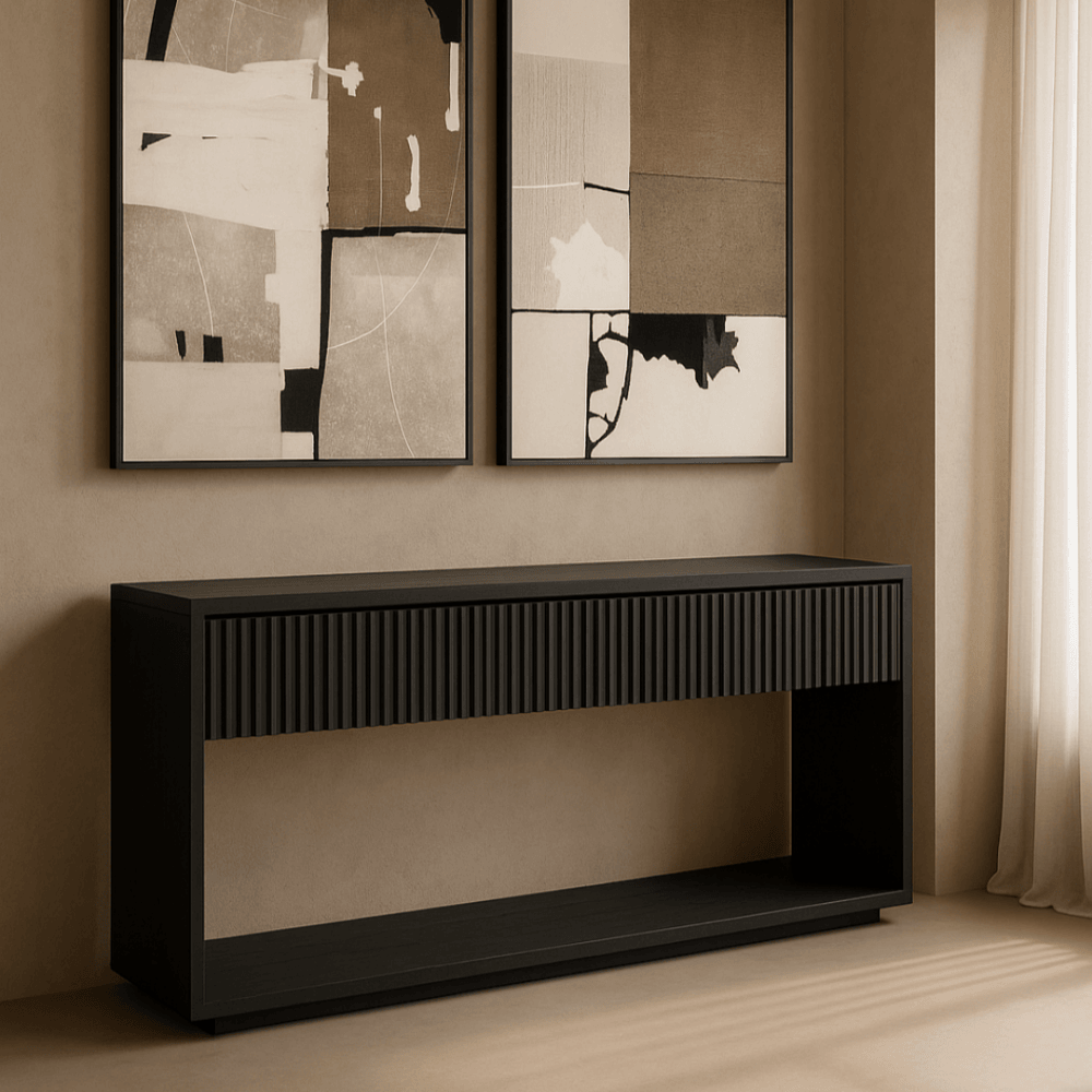The Costine Console Table is a chic and elegant addition to any living space, radiating a luxurious aura that captivates the eye. With convenient drawer storage, it offers both style and functionality, and its ribbed paneling on the drawers adds a unique and visually captivating touch.