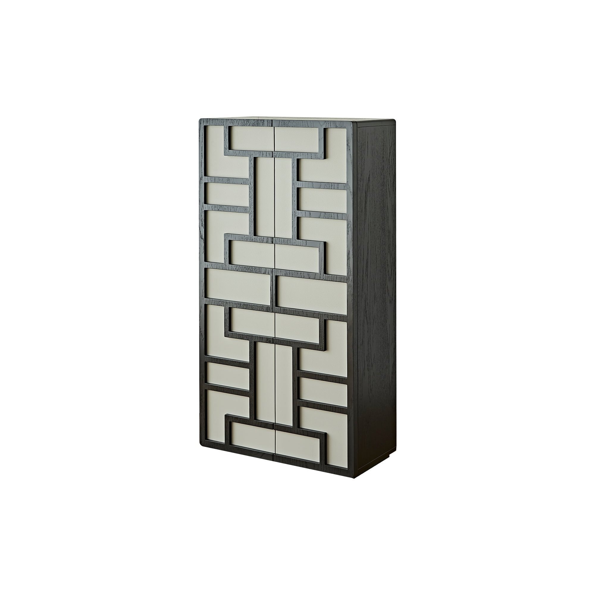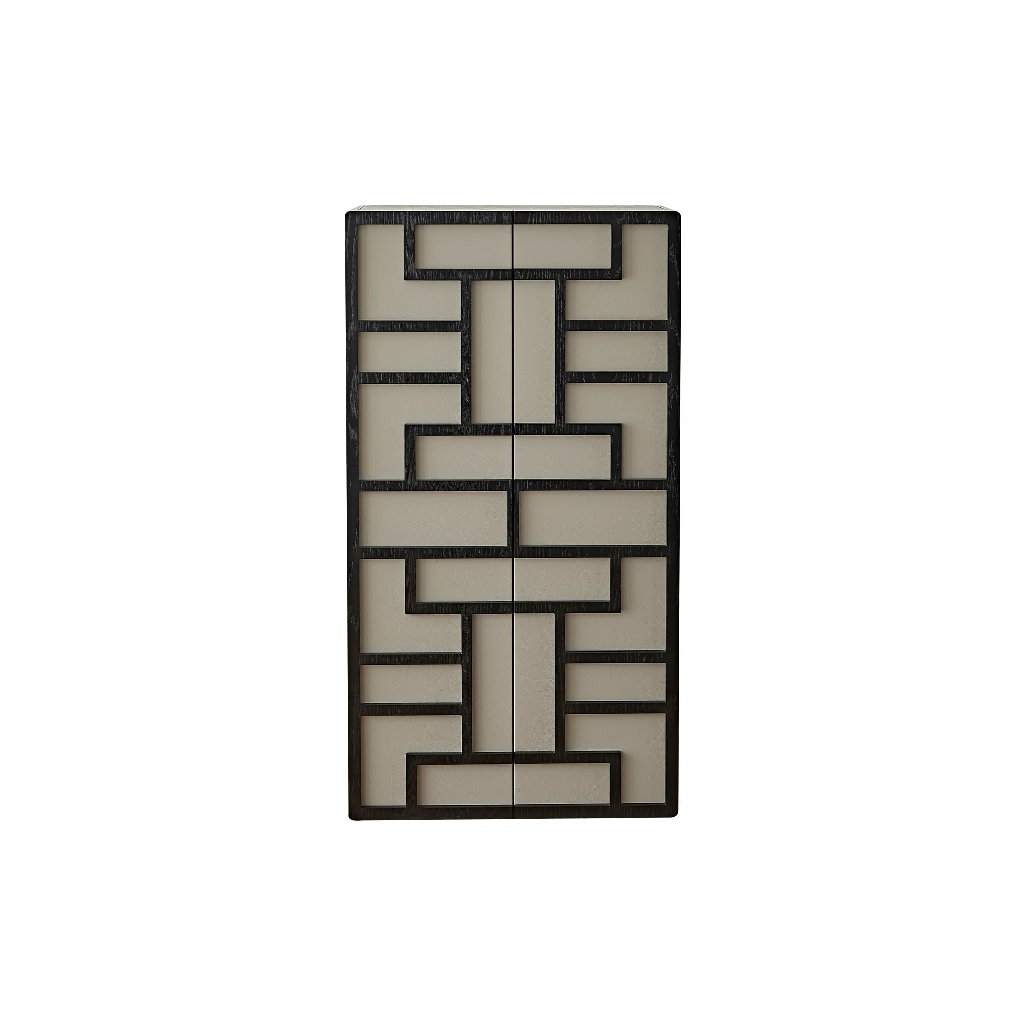 Introducing the Kamako Cabinet—an exquisite fusion of Art Deco elegance and modernist Asian aesthetics. Crafted from wenge-finished ash and textured grey embossed faux leather, this stylish bar cabinet features three shelves, perfect for showcasing your treasured items. Add character and sophistication to any home or hospitality setting with this stunning piece.