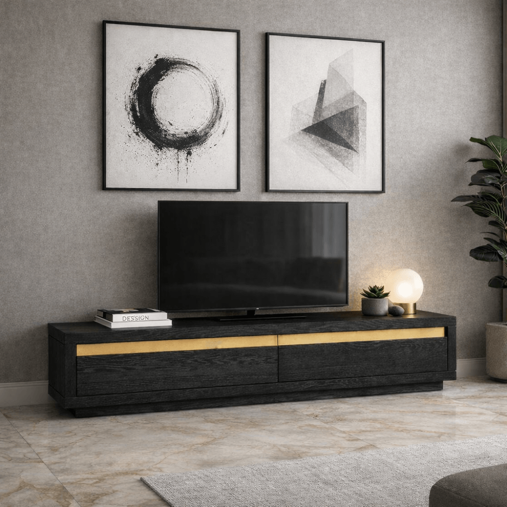 The Arosa Media Unit has 2-drawers and comes in a striking textured espresso oak veneer with brass inlay. Modern with an inspired design, the Arosa Media Unit can help achieve the perfect finish in any home or interior design project.