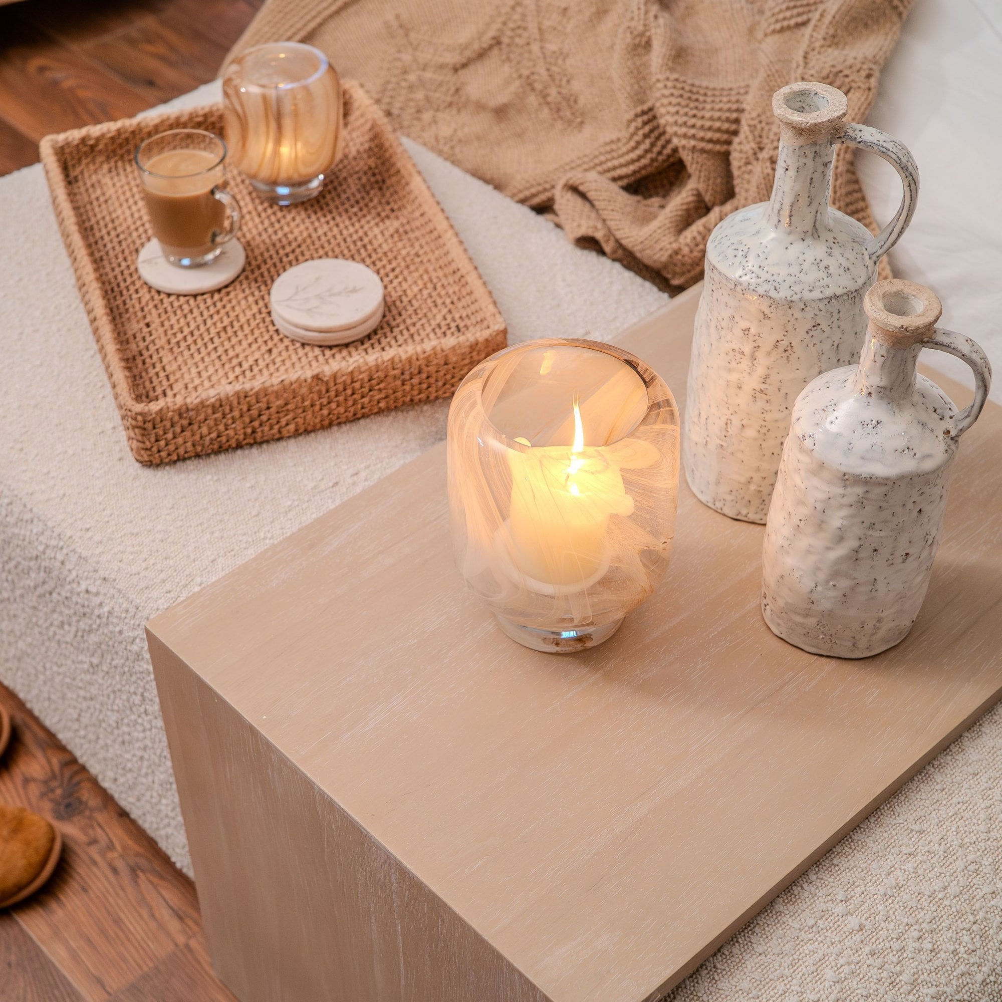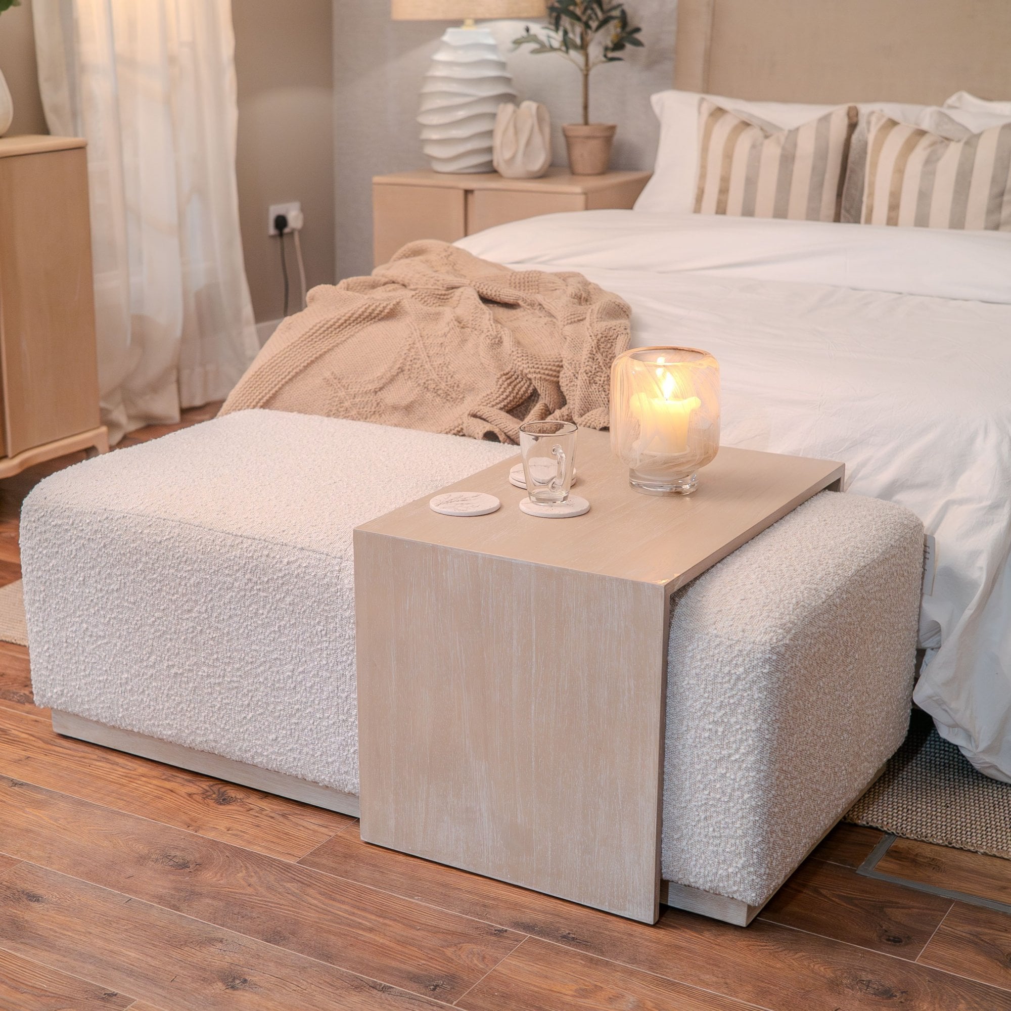 - Material: Bouclé & Oak