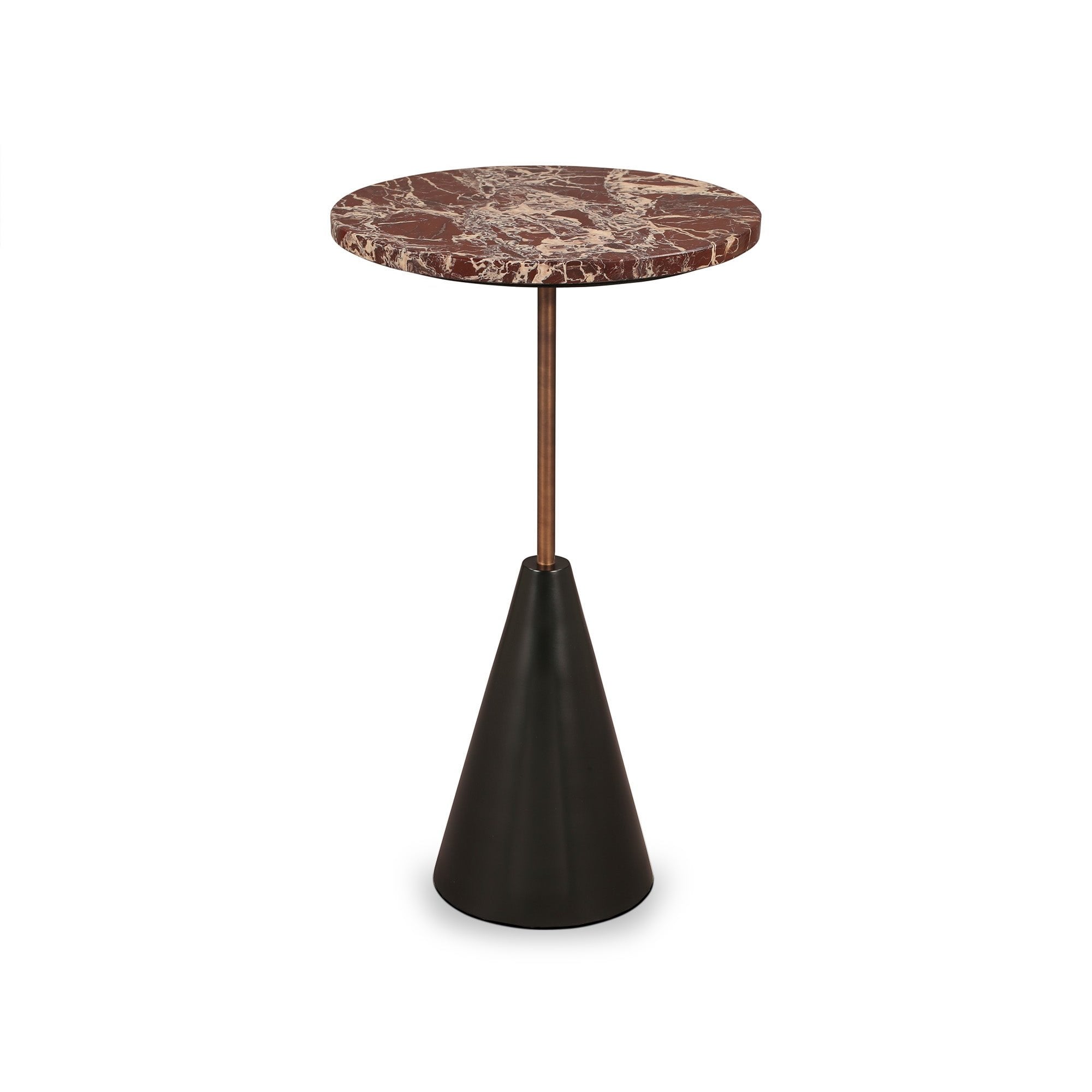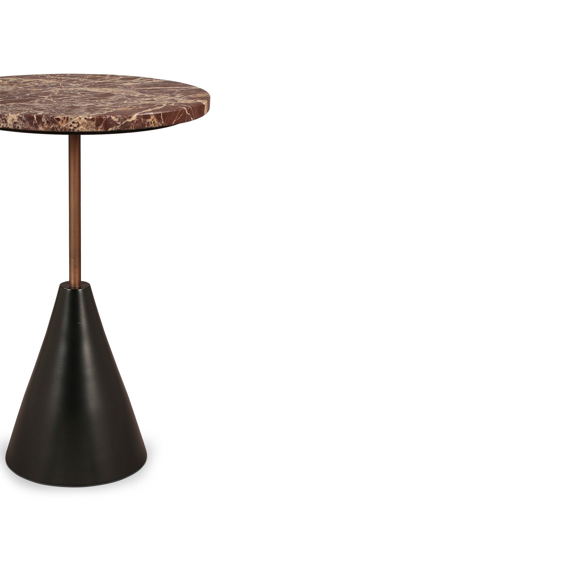 Levante marble tops a conical black base, connected by an antique bronze stem. A side table masterclass in contrast, it offers depth and design precision, complementing interiors that appreciate grounded elegance.