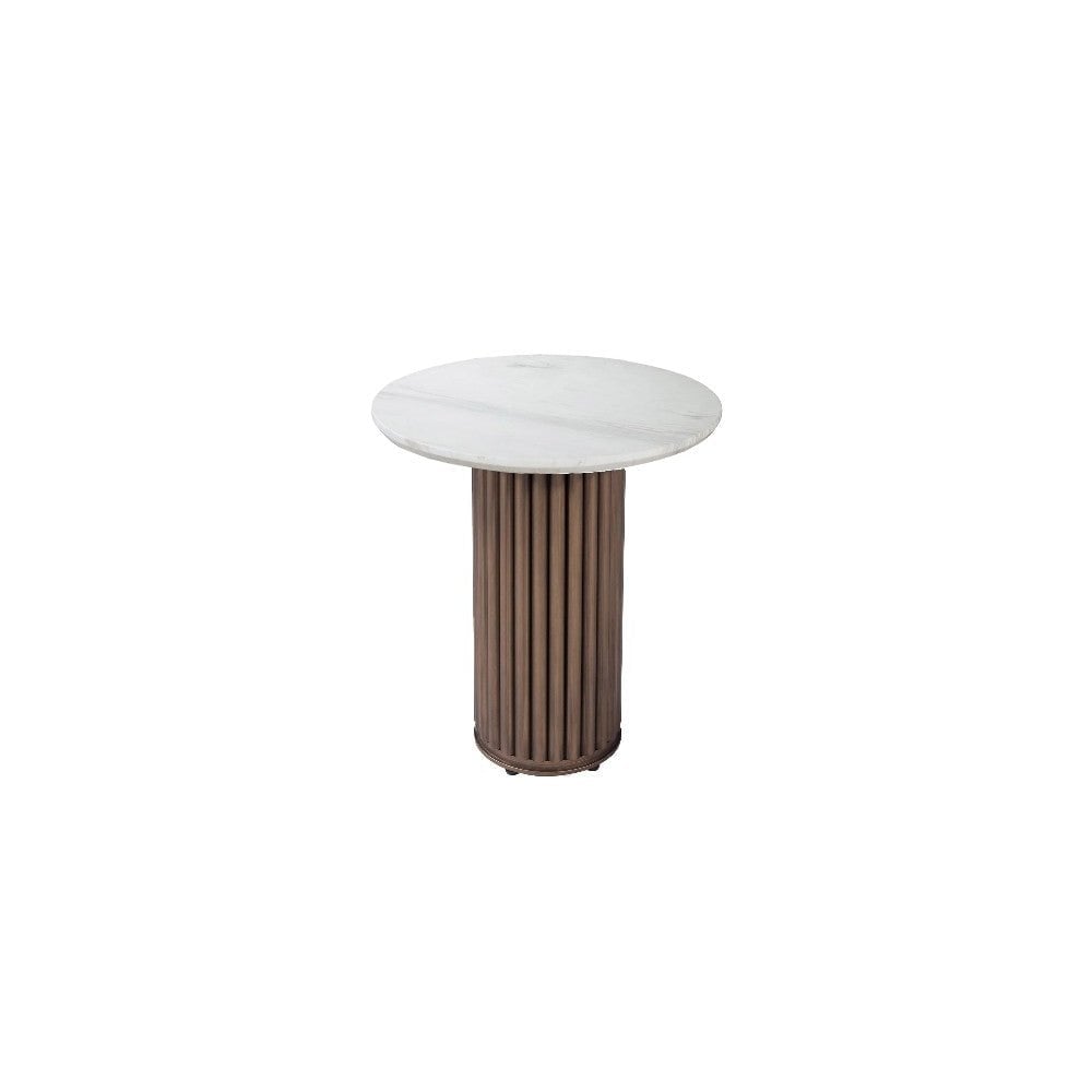 The Odessa Side Table is a stunning blend of elegance and contemporary design. Its circular silhouette exudes a sense of modern sophistication, making it a perfect addition to any stylish living space. Topped with a luxurious Jazz white marble surface, the table boasts an exquisite natural pattern that adds a touch of opulence. The base, crafted from brass-coated metal, not only provides sturdy support but also infuses a hint of glamorous warmth to the overall aesthetic. With its harmonious fusion of materials and sleek lines, the Odessa Side Table effortlessly elevates the ambiance of any room while offering a functional surface for your essentials.
