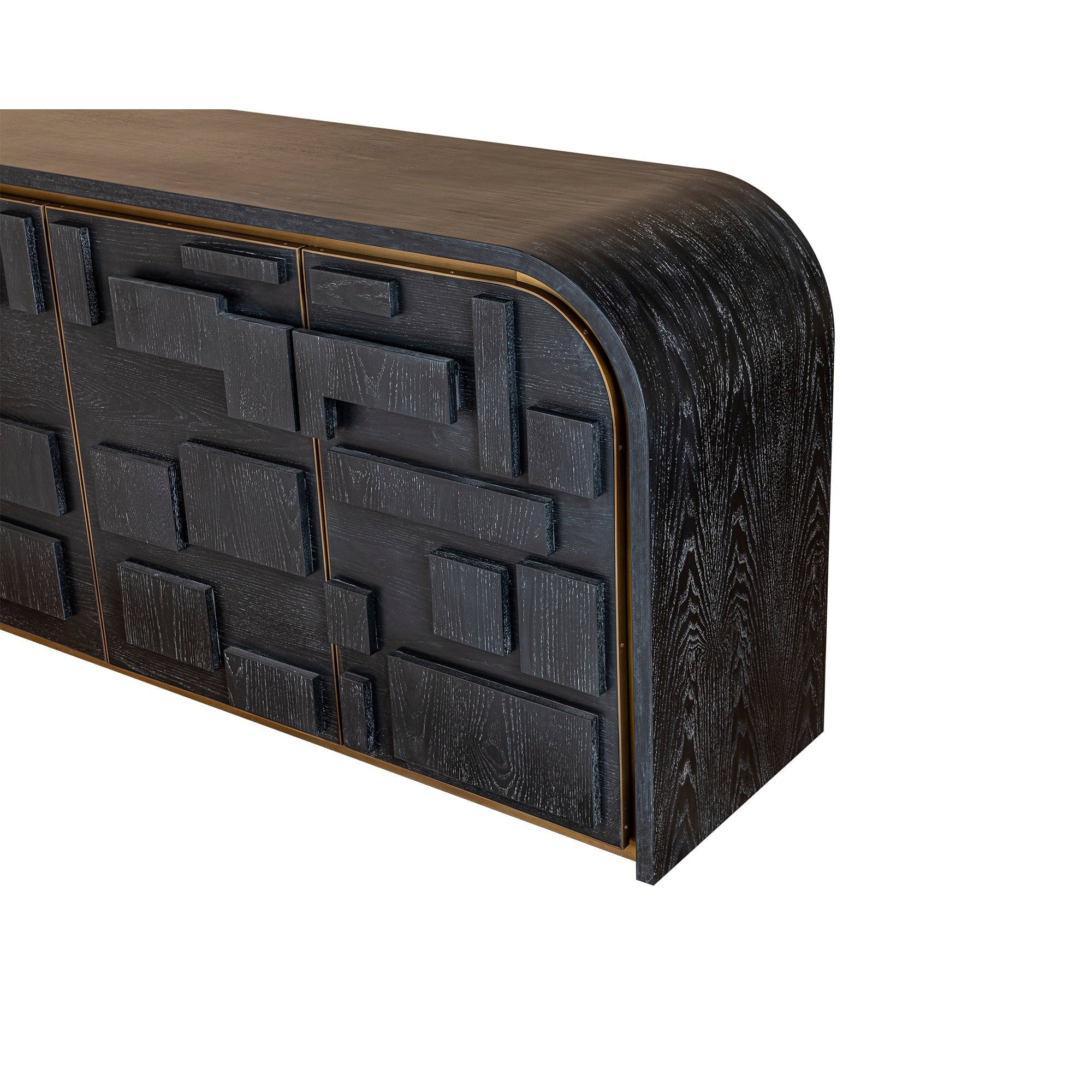 Experience the understated elegance of the Brutalist Four Door Sideboard, blending chic sophistication with mid-century modern appeal. Crafted from ebony cerused ash, it features striking brushed brass decorative trim that enhances its art deco design. The cabinet’s unique 3D effect and geometric elements create a perfect balance between informal charm and refined style.