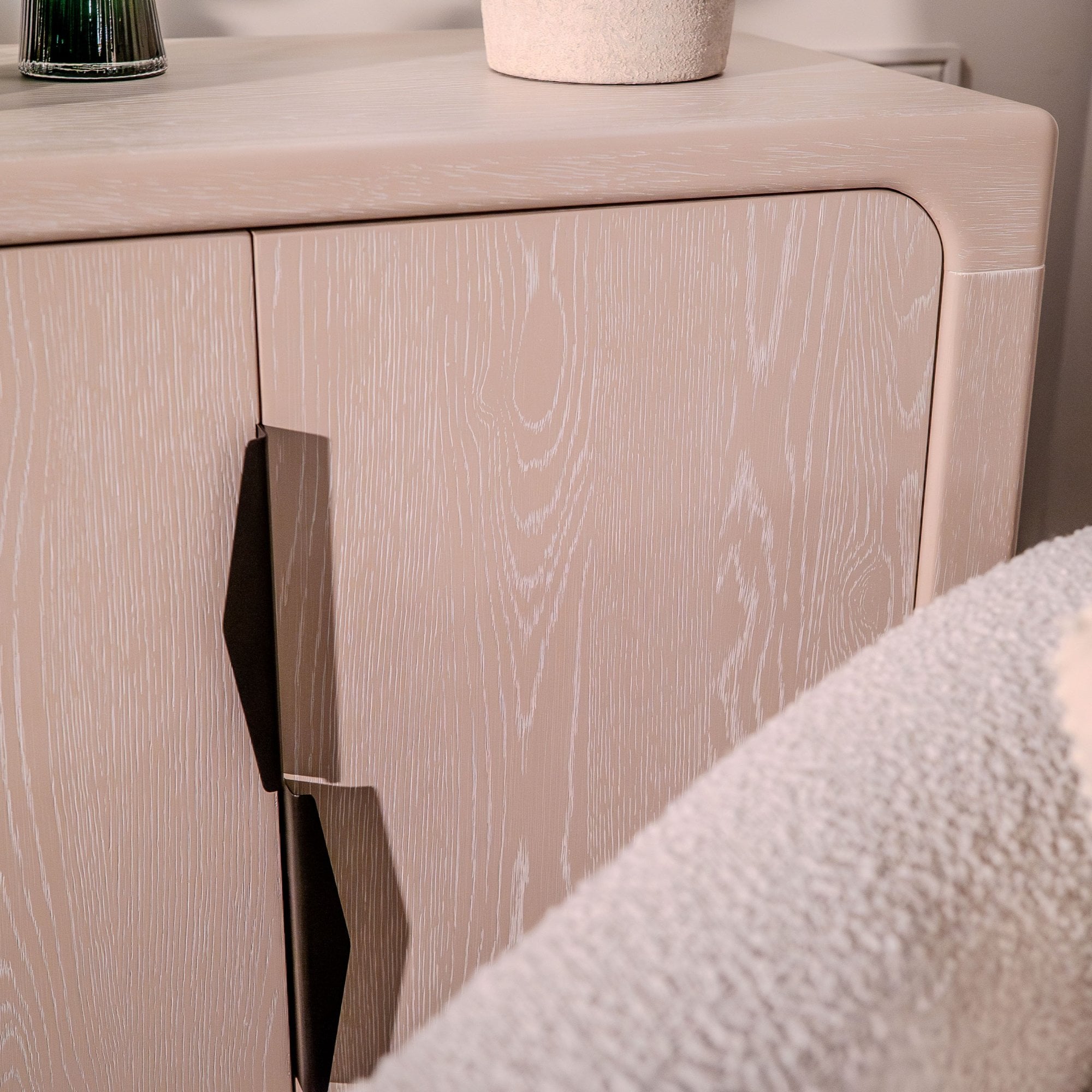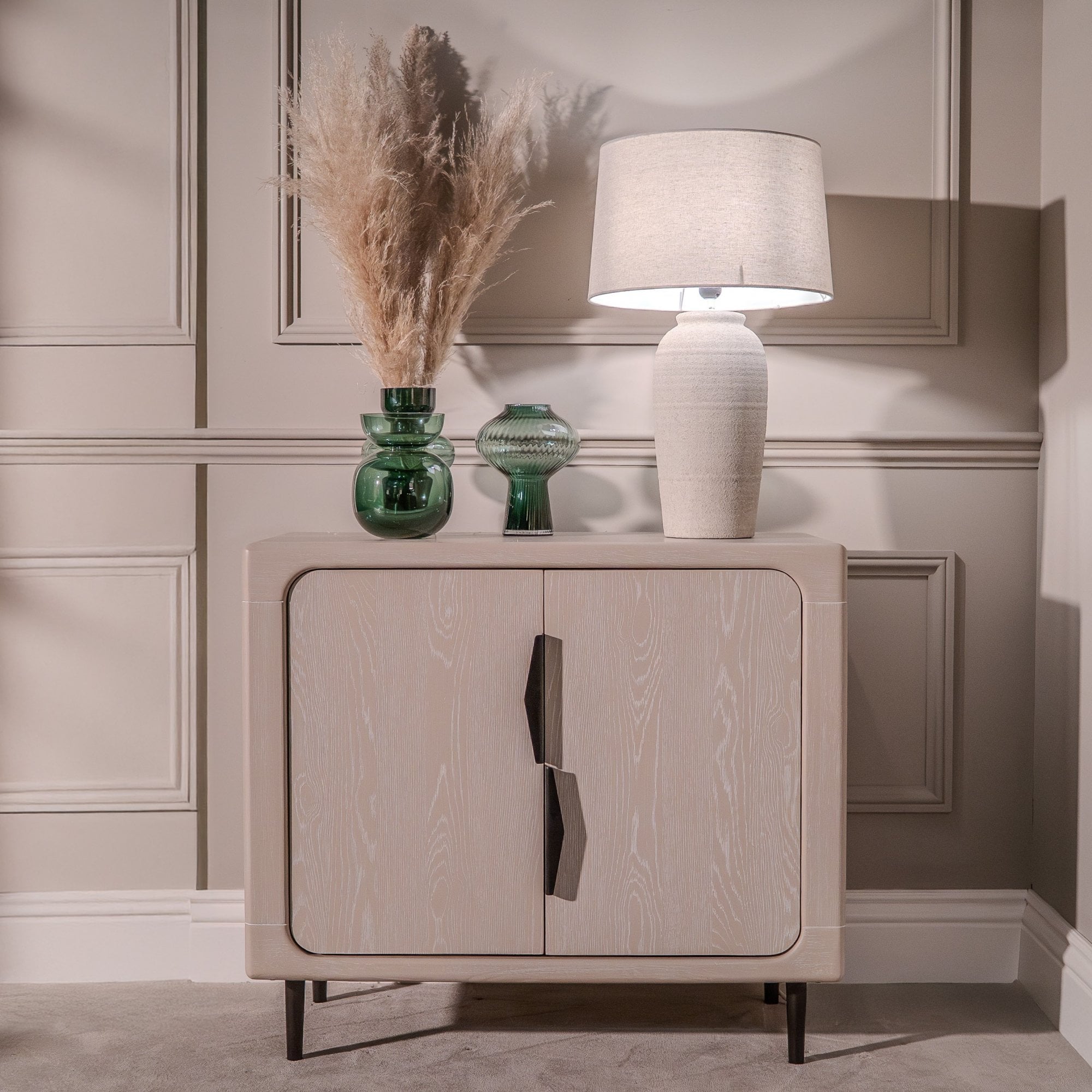 Sleek and versatile, this two-door cabinet offers a stylish solution for organizing your space. Made from durable light oak wood, its soft rounded edges complement its minimalist design. Inside, it features adjustable shelving to accommodate items of various sizes, making it perfect for storing books, tableware, or decorative pieces. The contrasting black handles are ergonomically designed for ease of use while adding a modern touch. Its compact size allows it to fit seamlessly into living rooms, dining areas, or bedrooms.