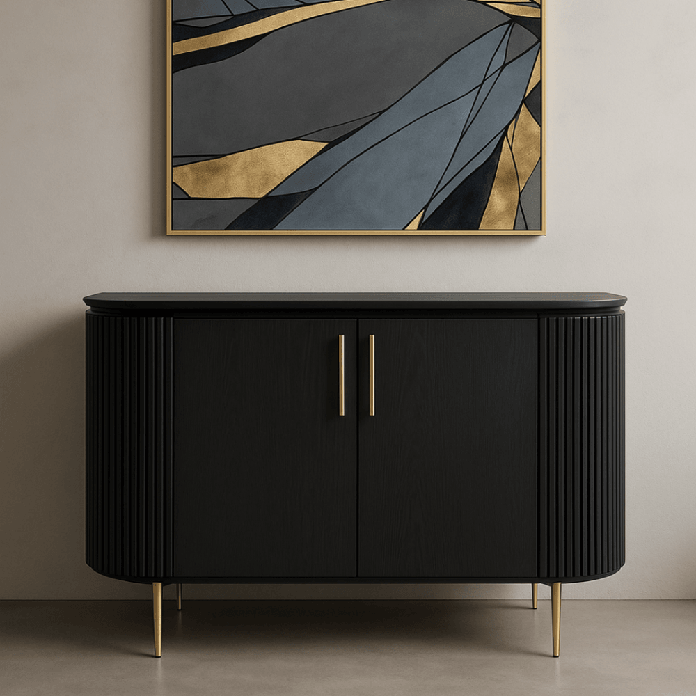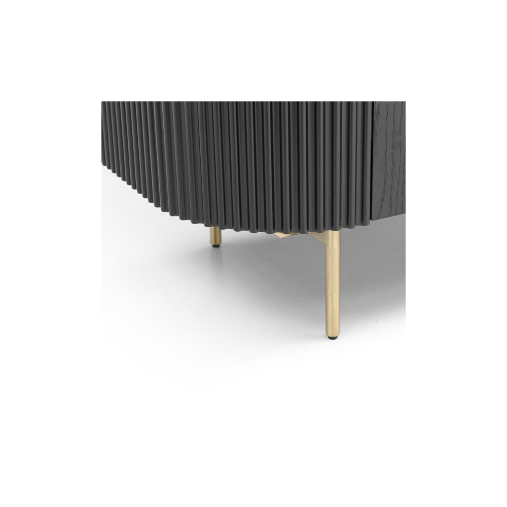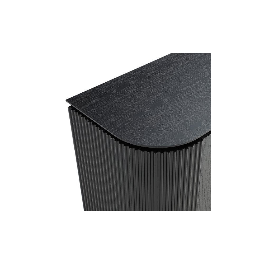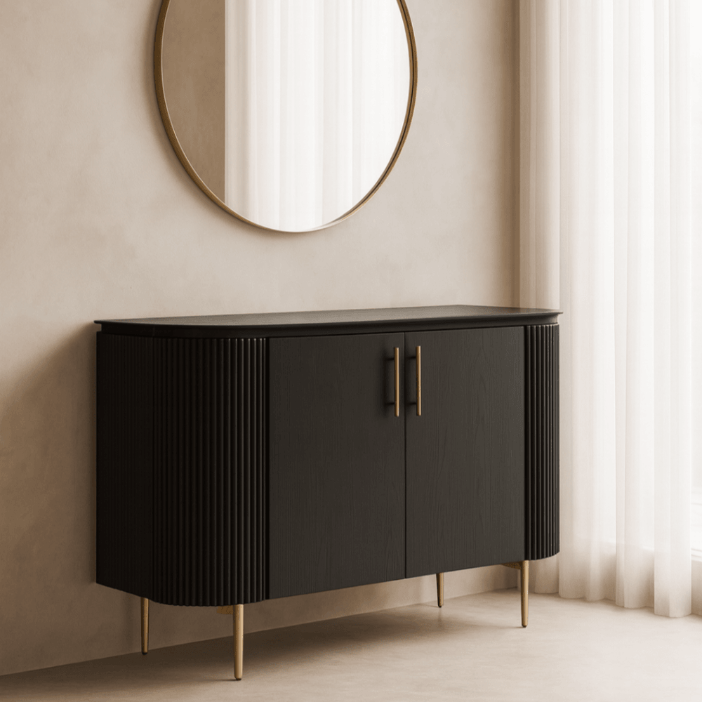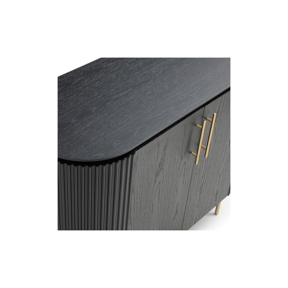 The Lantine 2 Door Cabinet is a stylish and functional addition to any home. Featuring a Matte black oak finish on the table top and doors, ribbed end panels, brass legs and handles, this cabinet is sure to make a statement in your home. With an internal 4-part shelving system for storage, the Lantine 2 Door Cabinet is the perfect piece to complete any space.