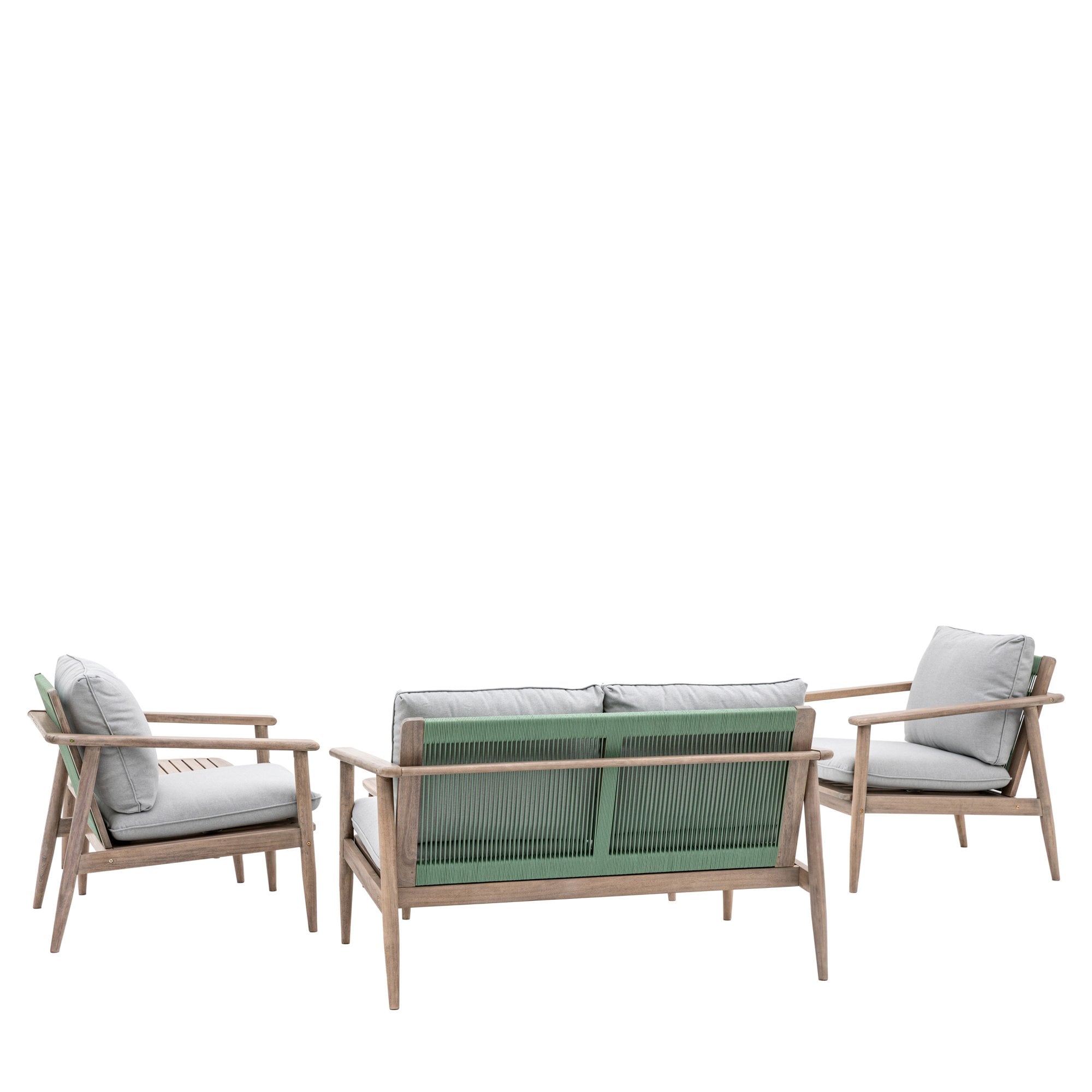 A contemporary lounge set with chic turned legs, slopped arms and a overall elegant design finished off with grey cushions, perfect for your outside space. Complete with a 2 seater sofa, 2 armchairs and a slatted top coffee table all made from Acacia wood with woven rope chair backs.