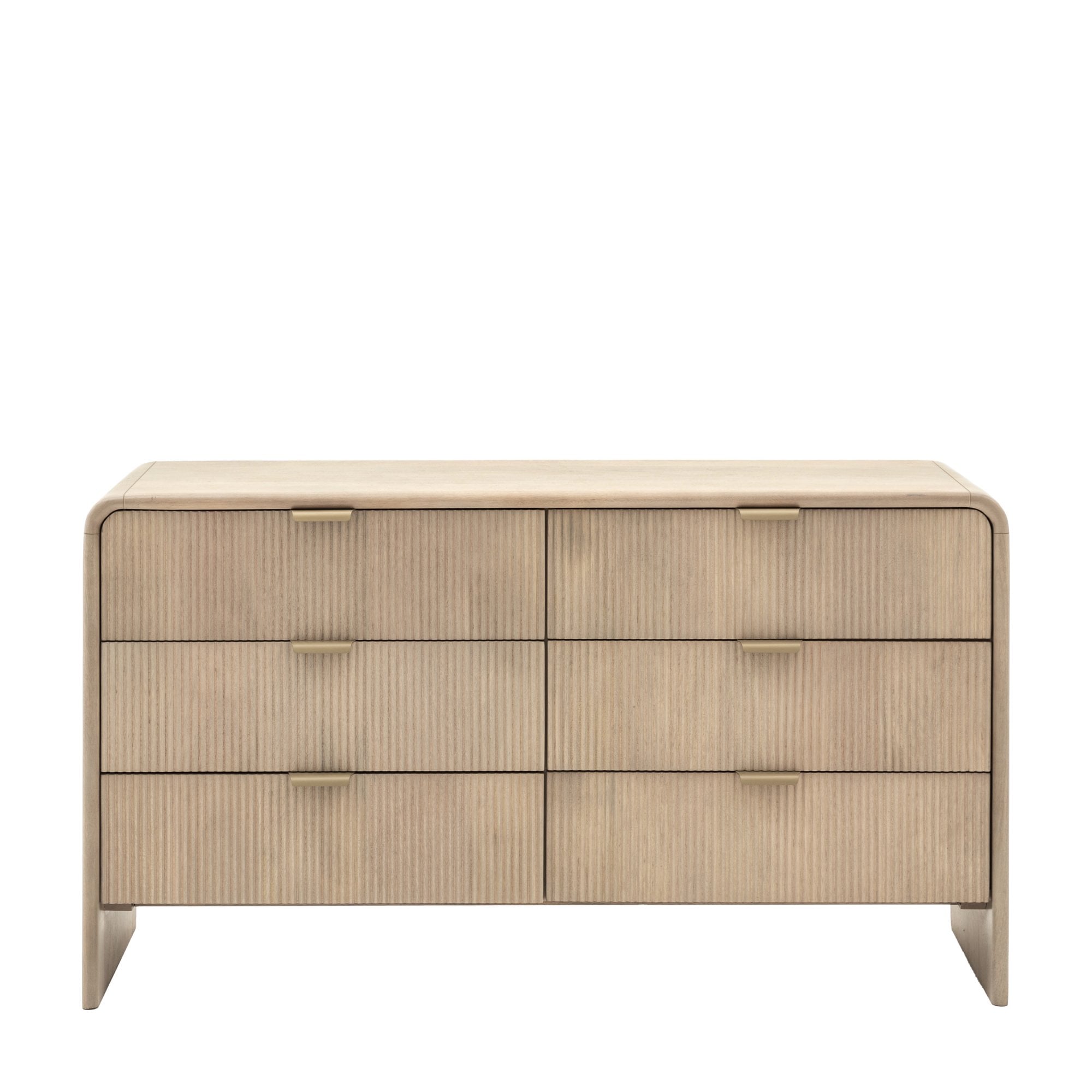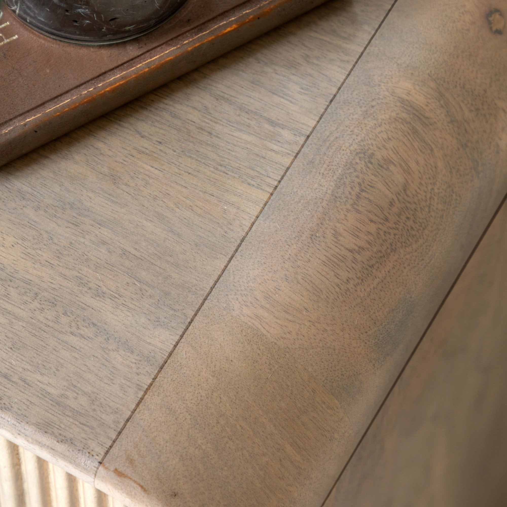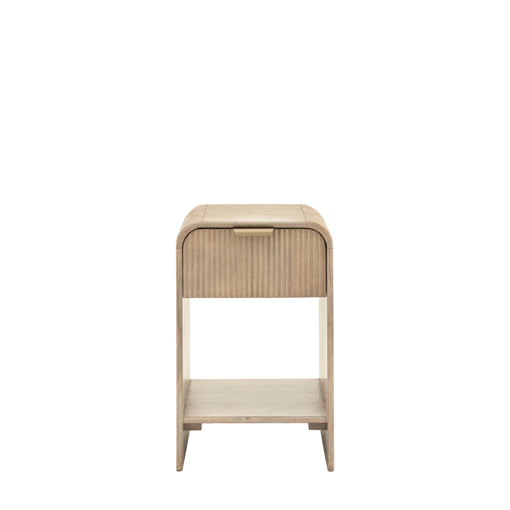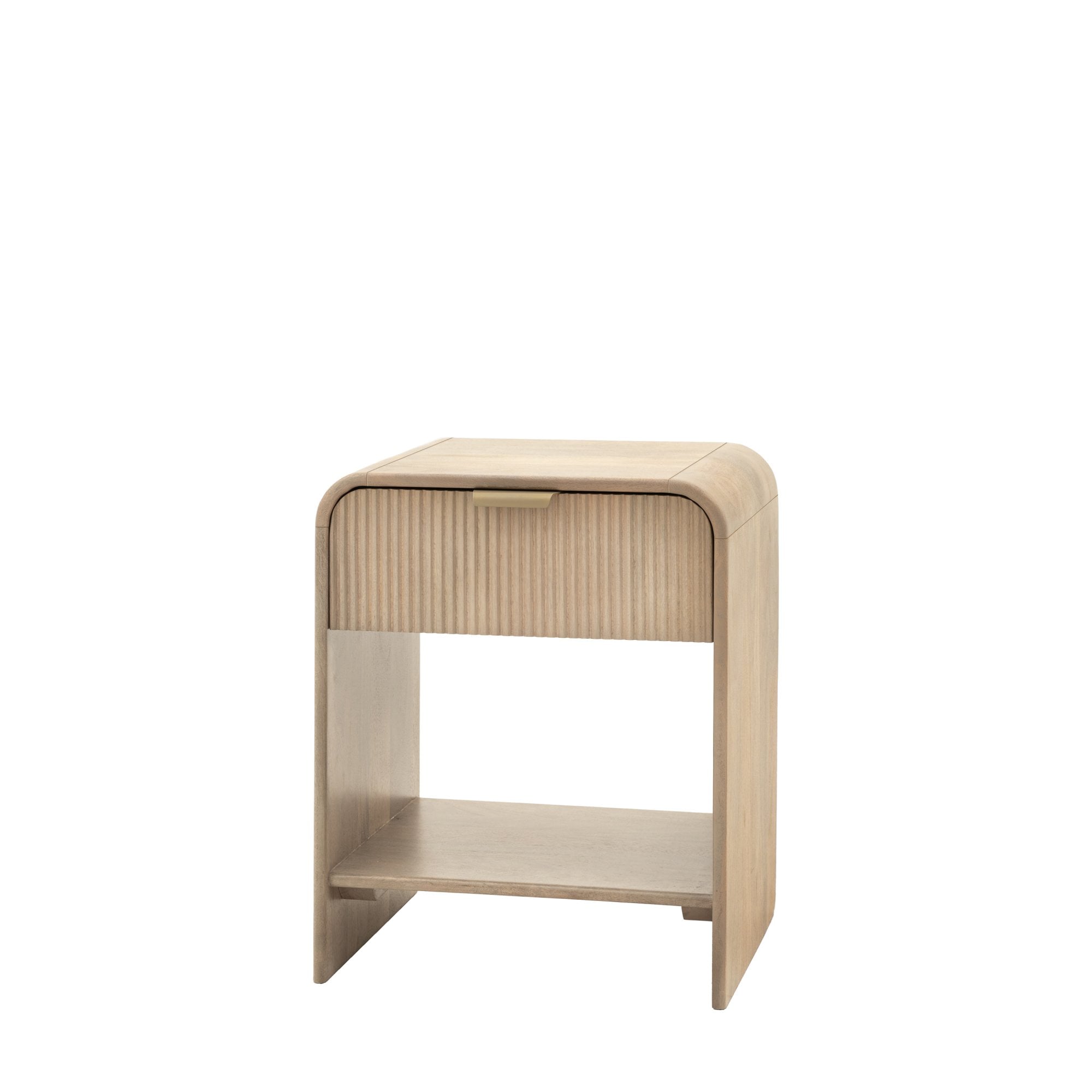 The sleek bedside table, with its curved design and fluted drawer, adds a touch of modern elegance to any bedroom. Crafted from high-quality wood, it offers both style and functionality. The spacious drawer and lower shelf provide ample storage for books, glasses, and other bedside essentials.
