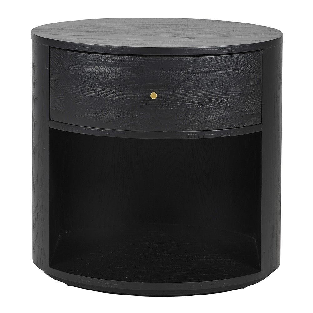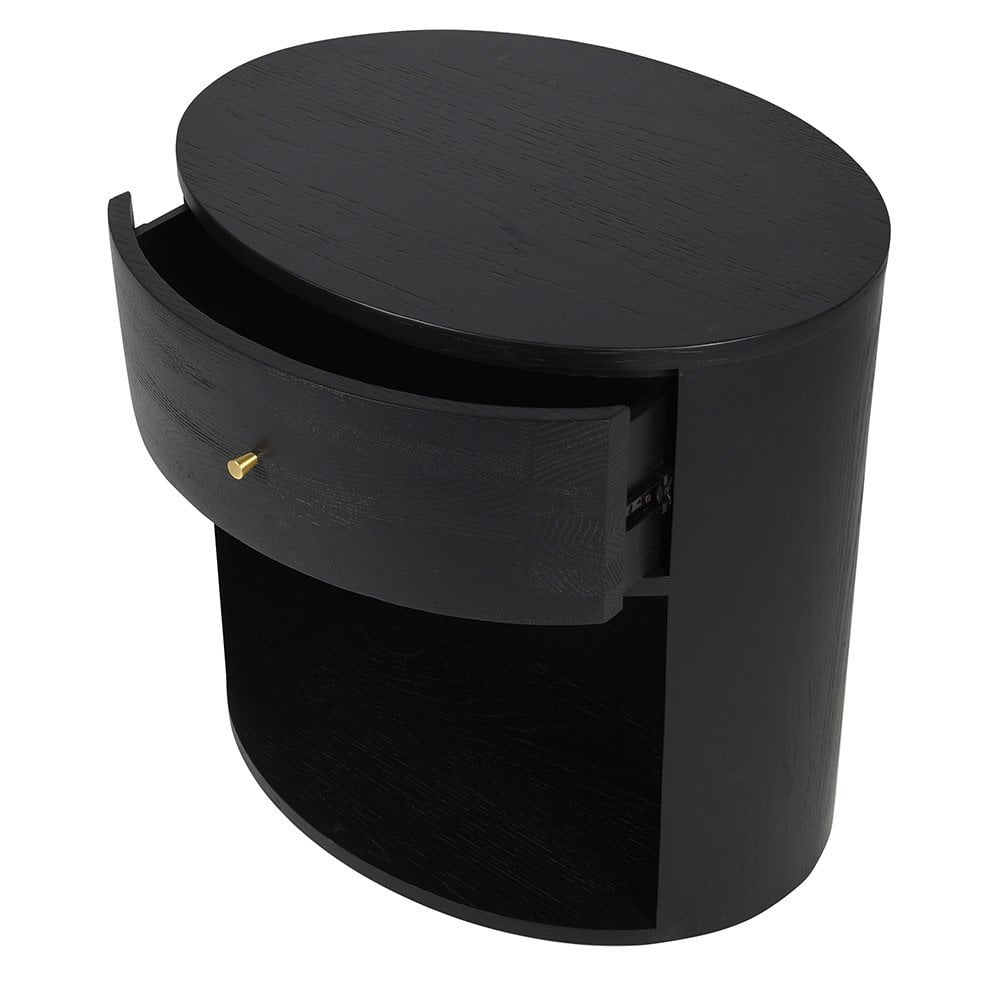 Elevate your bedroom décor with our sleek Black Oval Bedside with Brass Handle, a contemporary and functional addition to your home. Crafted from oak with a sleek black finish and featuring brass handles, this bedside table offers a spacious drawer and shelf for styling. Ideal for your bedroom, guest room, or even the living room, it adds both style and practicality to your living space.
