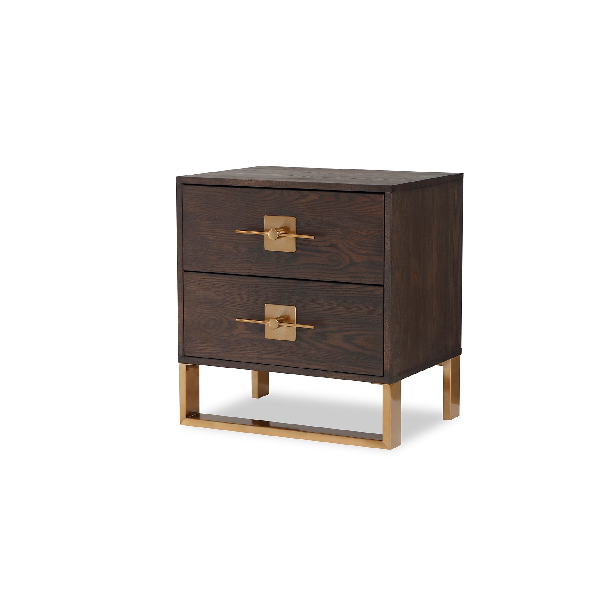 Enhance your space with the Ophir Bedside Table, handcrafted from dark brown ash veneer and accented with brushed brass fittings. Featuring two essential drawers with geometric handles, this piece offers stylish storage while adding sophistication to any bedroom. Ideal for residential and boutique hospitality settings alike.