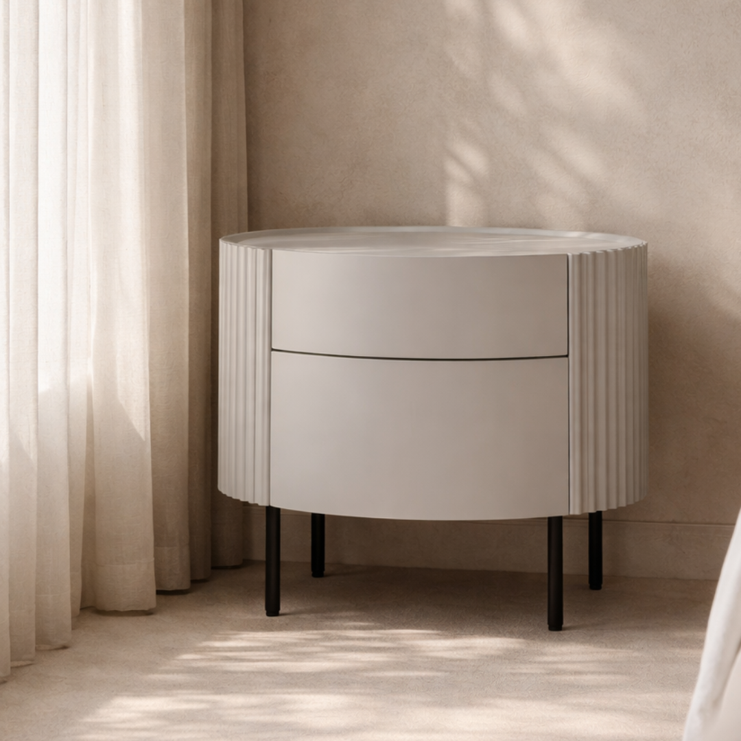 The Lantine Bedside exudes a chic and fresh contemporary design that instantly elevates the ambiance of any bedroom. Its light grey lacquer finish not only imparts a clean and modern aesthetic but also brightens the space. The ribbed side details offer a unique touch, adding depth and texture to the design. Supported by sleek black legs, this bedside table strikes a perfect balance between sophistication and functionality. With two drawers for storage and an elegant oval top, the Lantine Bedside is not only a stylish addition but also a practical and versatile piece that complements a range of interior styles.