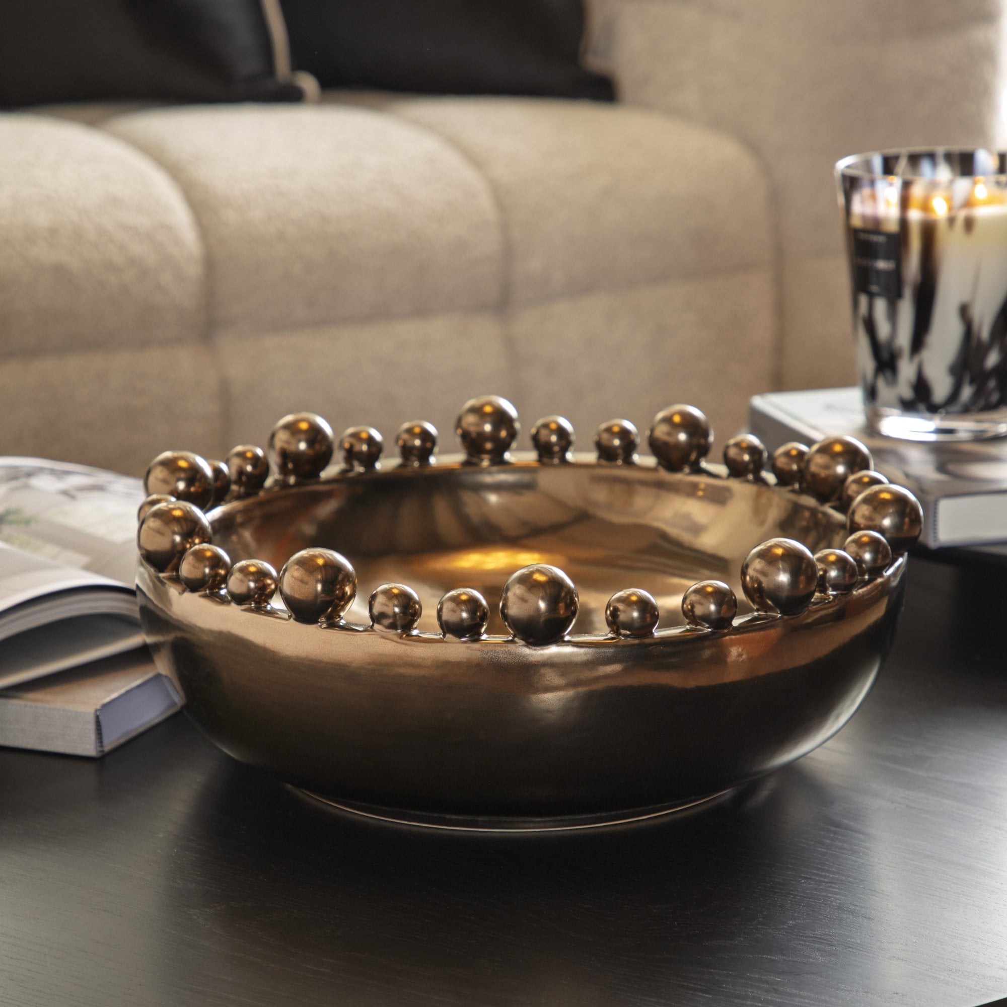 An exquisite ceramic Bronze Bobble Edged Bowl, a work of art in itself. The sleek bronze surface, adorned with playful bobble edges, creates a perfect balance of modernity and charm. The slightly reflective sheen of the glazed finish adds a refined warm sheen, making it a captivating piece that effortlessly elevates any space. A decorative bowl that turns ordinary into extraordinary.