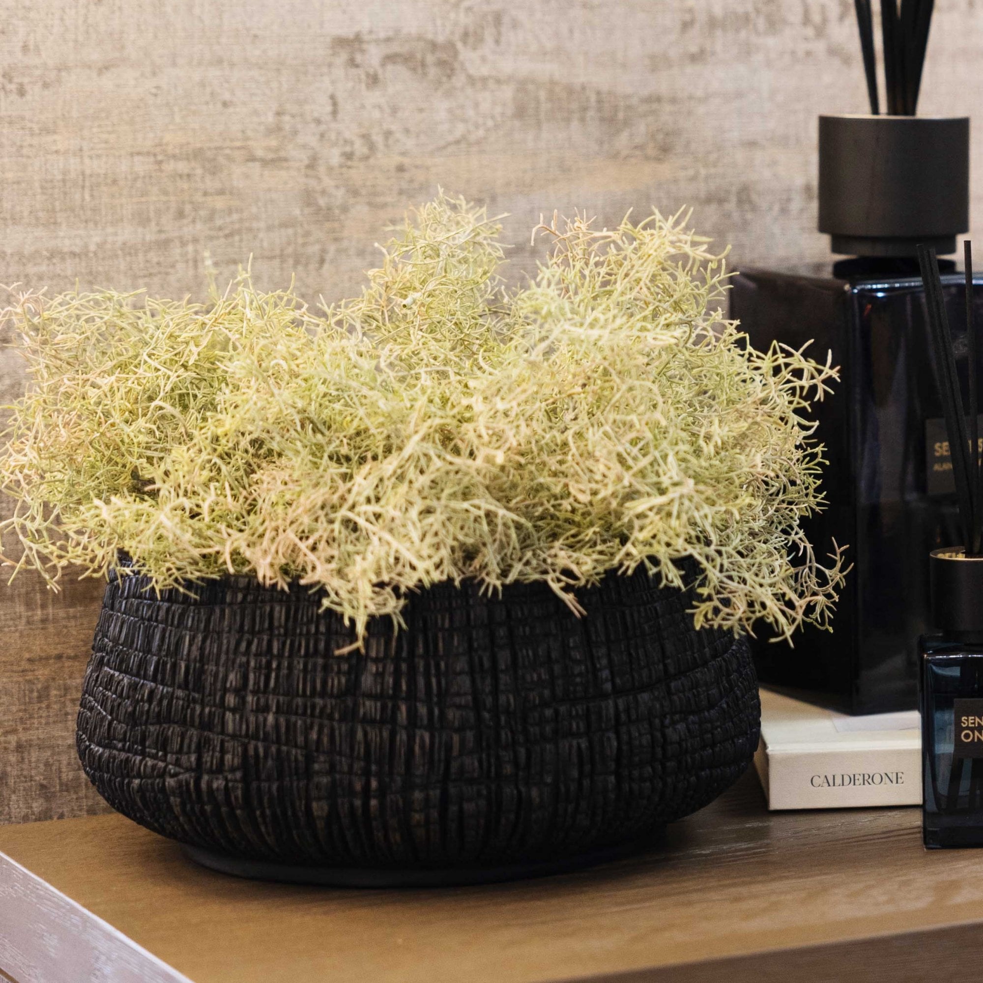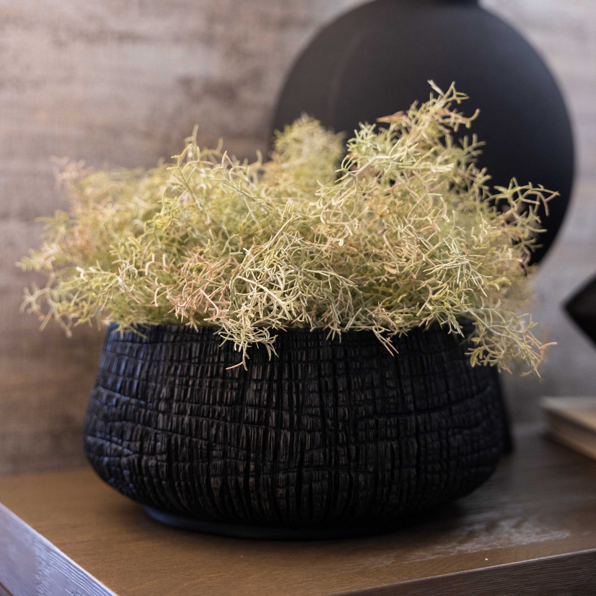 The large, low black yakisugi textured pot presents a striking fusion of traditional Japanese craftsmanship and contemporary design. Its compact size makes it perfect for small spaces, while its charred wood appearance, achieved through the yakisugi technique, adds a sense of depth and texture
