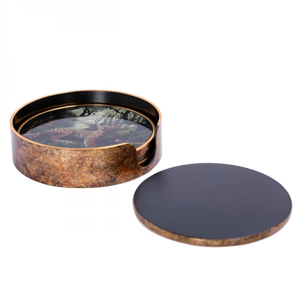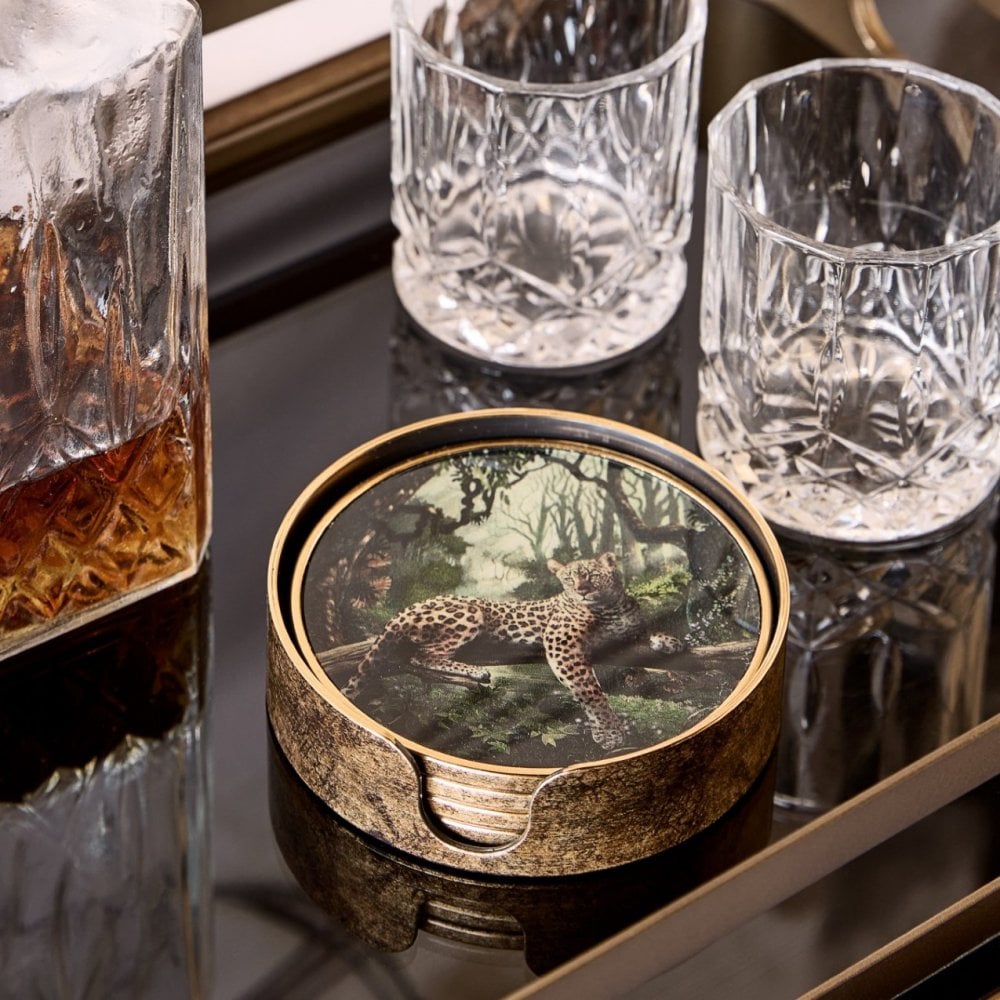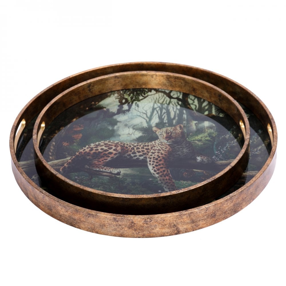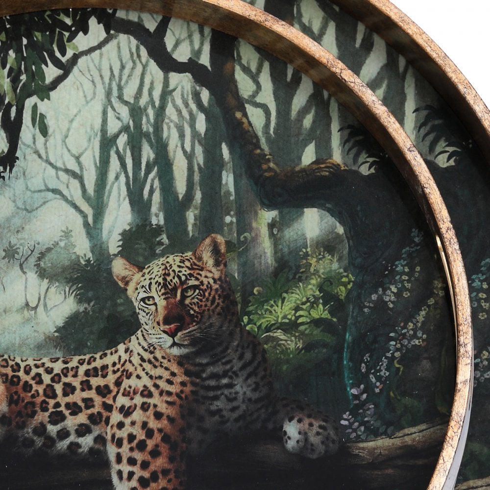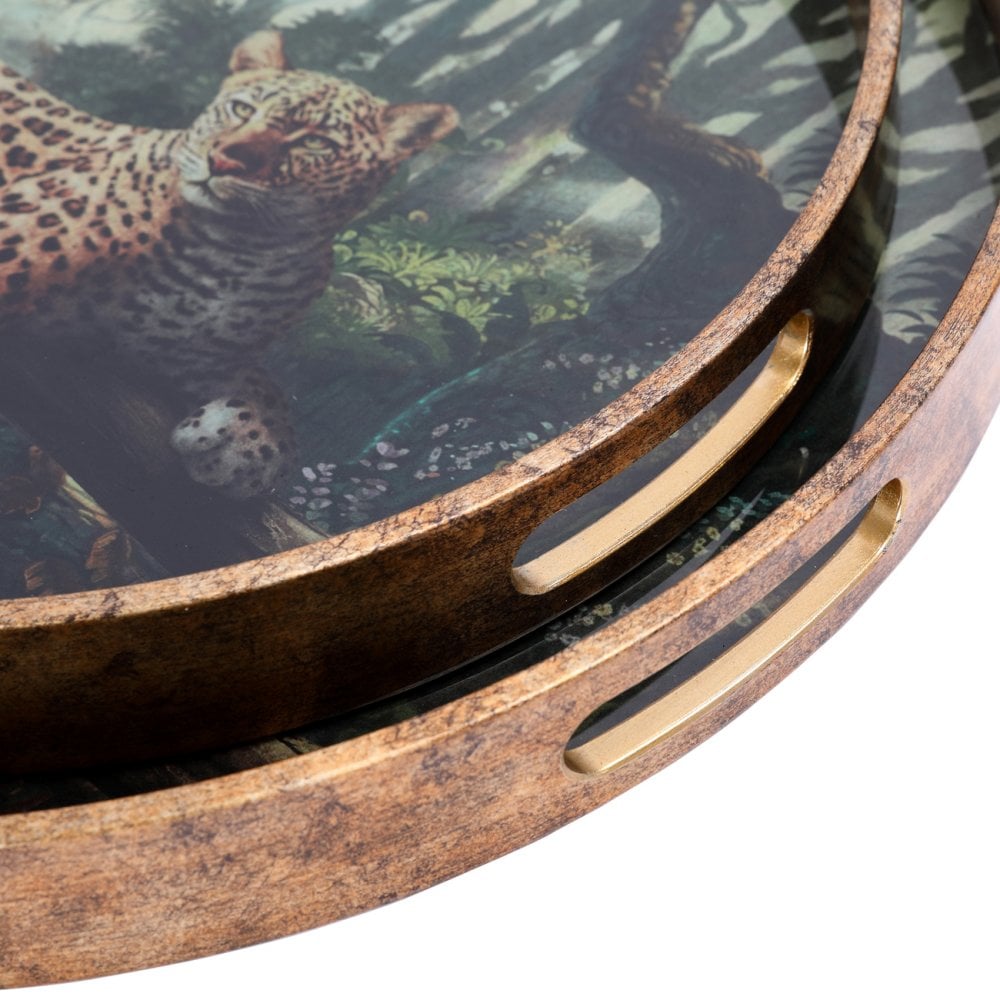 A bold and practical addition to any interior, this set of two decorative trays features our dramatic Lounging Leopard design. Richly printed and encased beneath smooth glass, the jungle-inspired artwork is framed by painted antique gold-effect rims for a refined finish. Perfect for serving drinks, styling a coffee table or displaying decorative accents, they bring both colour and character to any setting. Other items in the Lounging Leopard collection include a matching set of nesting tray tables and coordinating coasters , ideal for protecting surfaces while creating a cohesive, curated look.