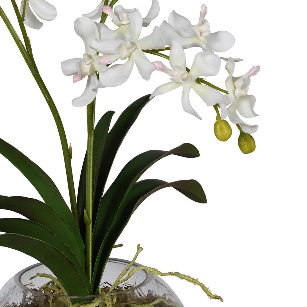 A White Faux Orchid displayed with moss & root detail is a stunning decorative arrangement featuring a group of white orchids plant nestled in a clear globe glass bowl. The plant is surrounded by lush faux green moss, creating a visually appealing and elegant display. The domed glass bowl allows for a clean yet minimalist and contemporary look, making it a perfect centerpiece or decorative item for any interior space on a kitchen island, dining or console table.