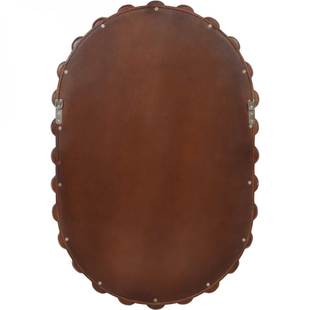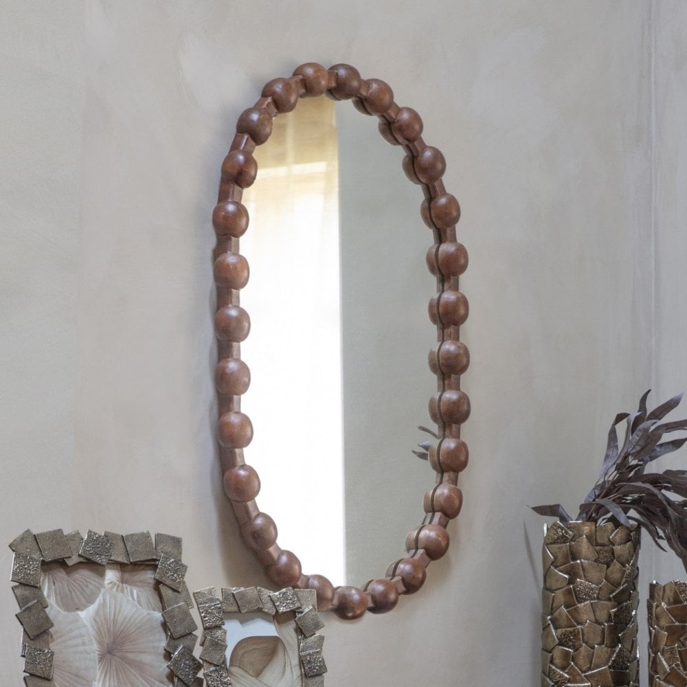 The Carmel Solid Wood Carved Bobble Mirror is a stunning and elegant looking glass in an oval shape. The mirror is framed with intricately carved bobble detailing, adding texture and art deco appeal. The clear glass mirror centrepiece provides a reflective surface that enhances the sense of space and light in your home and it chimes perfectly with our wider Carmel collection. Crafted from solid mango wood with a dark stain finish, it showcases the natural beauty and subtle grain of the wood. Mirror can be hung in portrait elevation only.