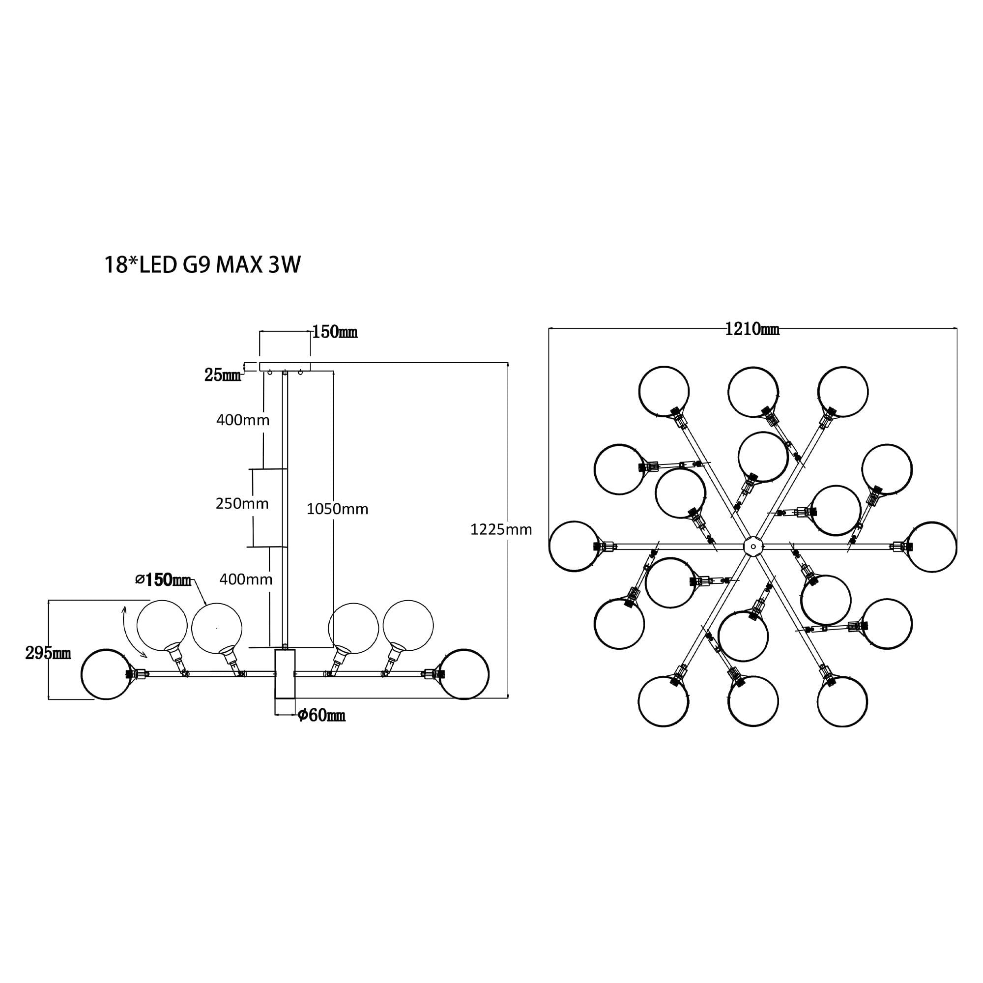 The Baldwin Pendant Ceiling Light features antique brass detailing and a striking globe design crafted from clear glass. Its unique elegance enhances any living space, offering a sophisticated lighting solution. Requires 18 x LED G9 MAX 3W bulbs (not included). Dimmable with appropriate bulbs and switches.