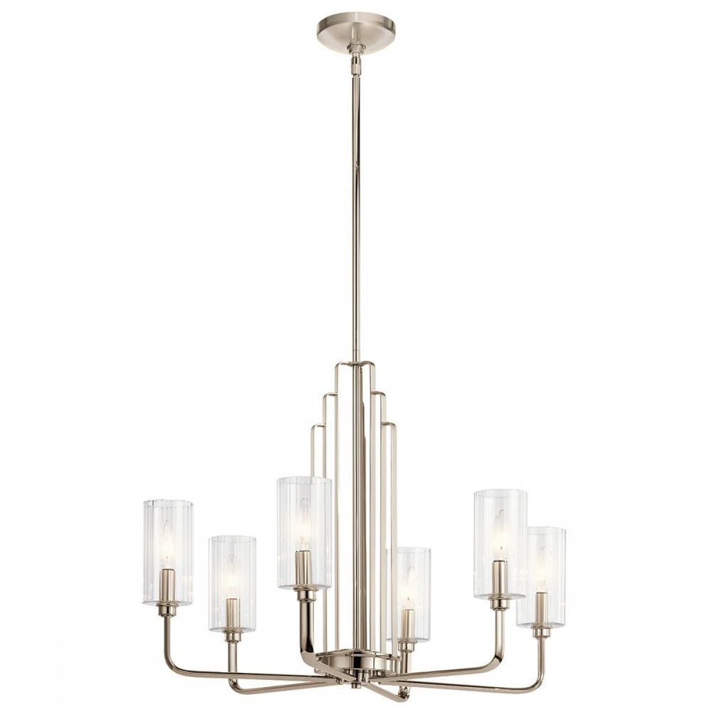 The Kimrose collection is an Art Deco masterpiece. Its geometric shapes take center stage in a gorgeous Polished Nickel finish. The shades are clear fluted glass, meaning they're ribbed gently with vertical grooves to produce a subtle lighting effect. For lighting without the effect, simply remove the shades.