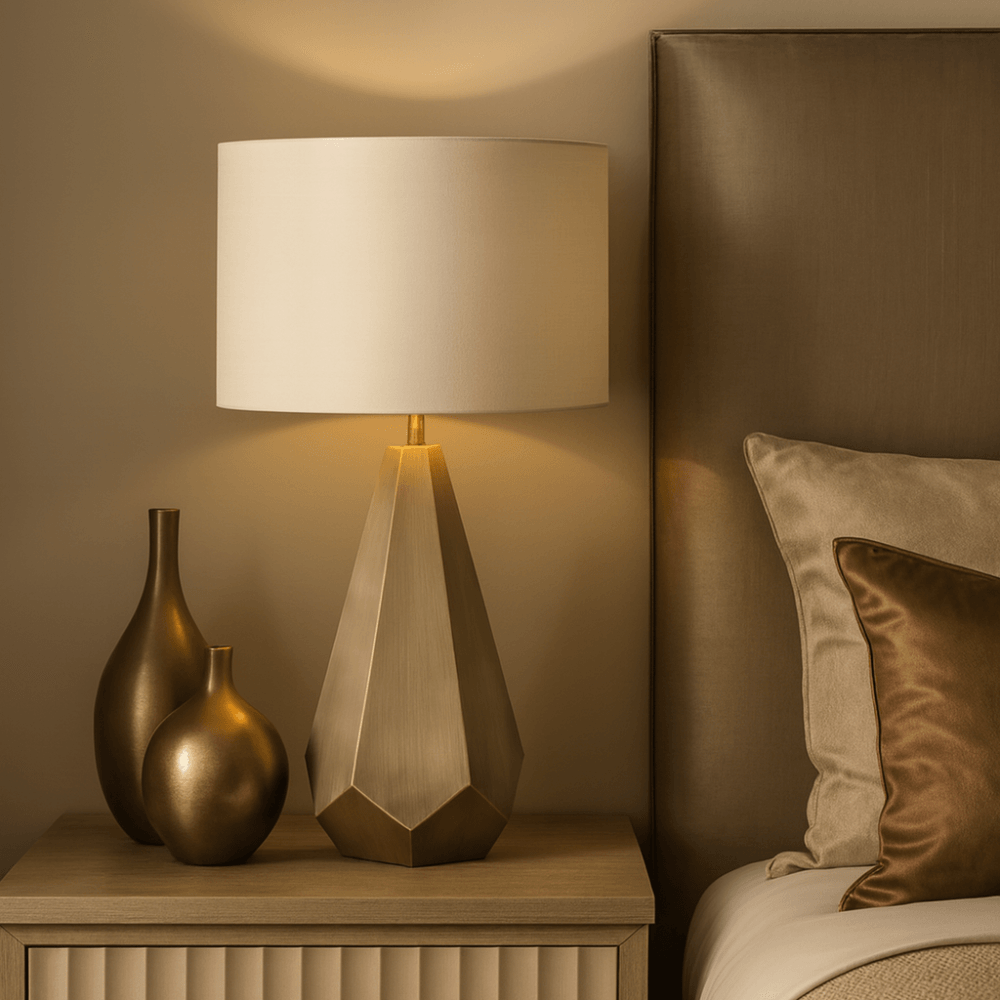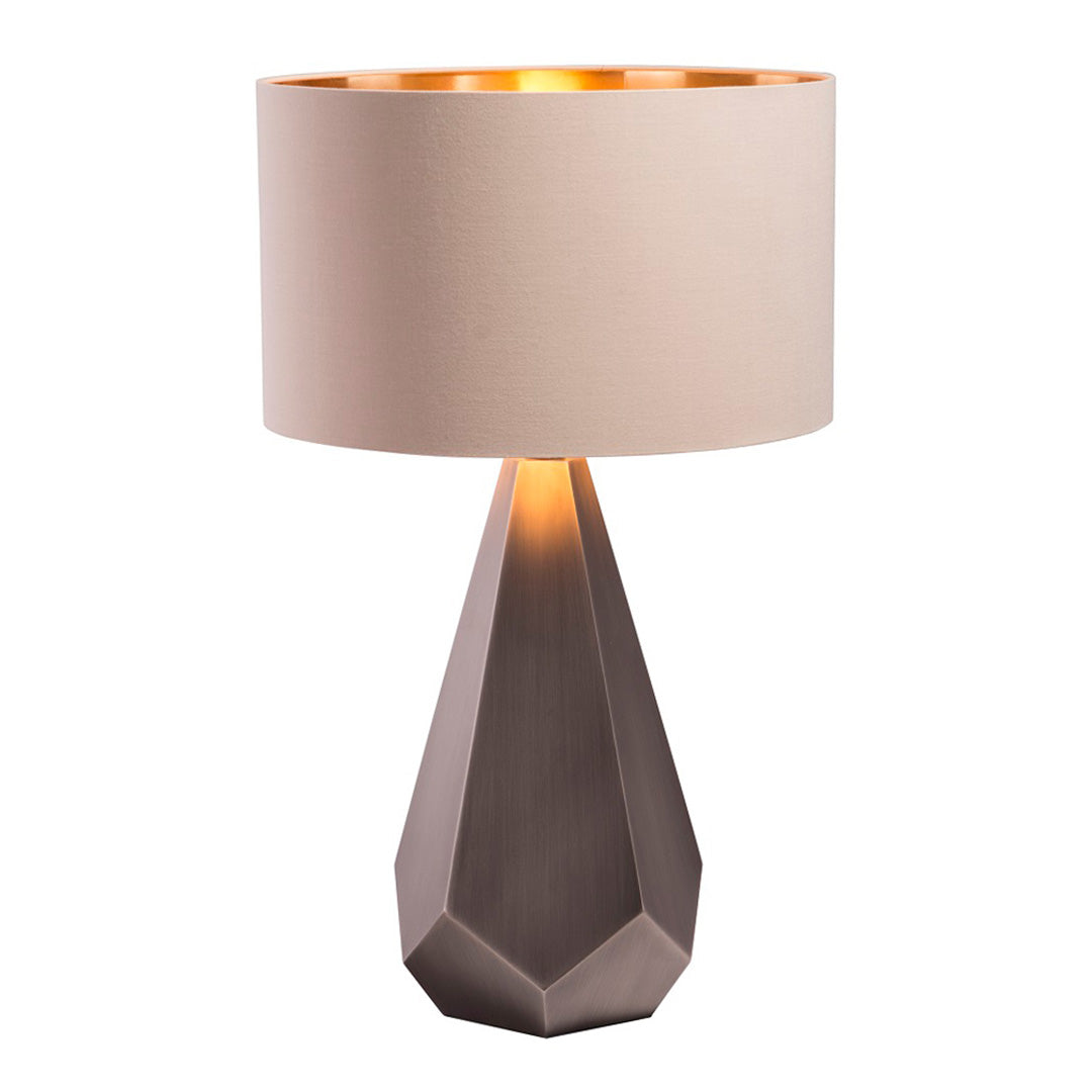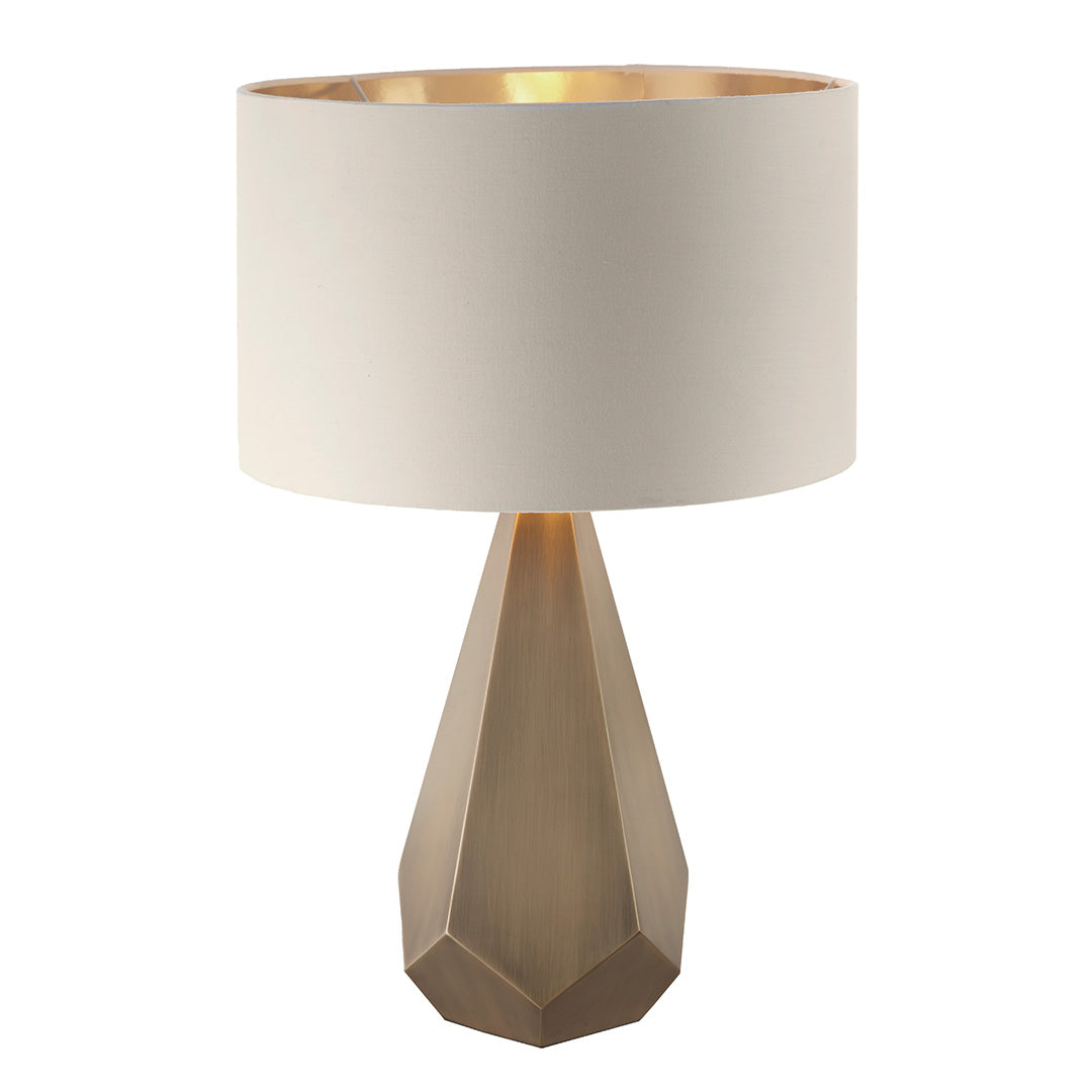 The Agato Table Lamp features a unique, multi-faceted tapered design that adds an artistic touch to any space. Its striking silhouette captures attention while providing a modern aesthetic. Topped with a soft latte fabric shade lined with gold, this lamp exudes warmth and sophistication, creating a cozy atmosphere. Perfect for living rooms, bedrooms, or home offices, the Agato Table Lamp seamlessly blends style and functionality, making it an exceptional accent piece that enhances your décor.