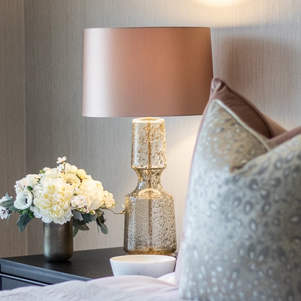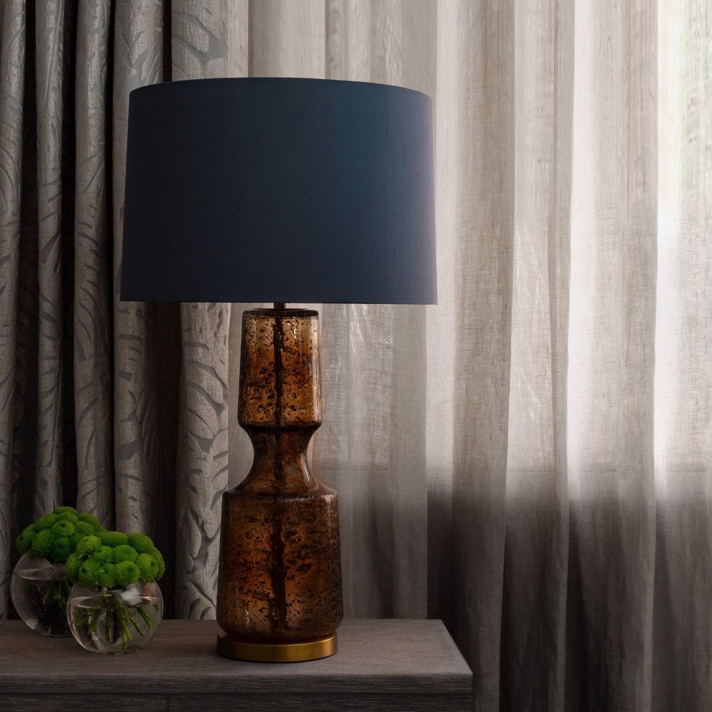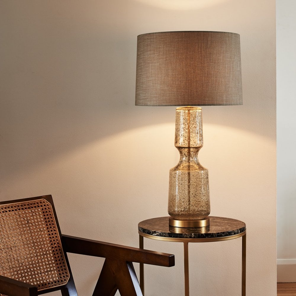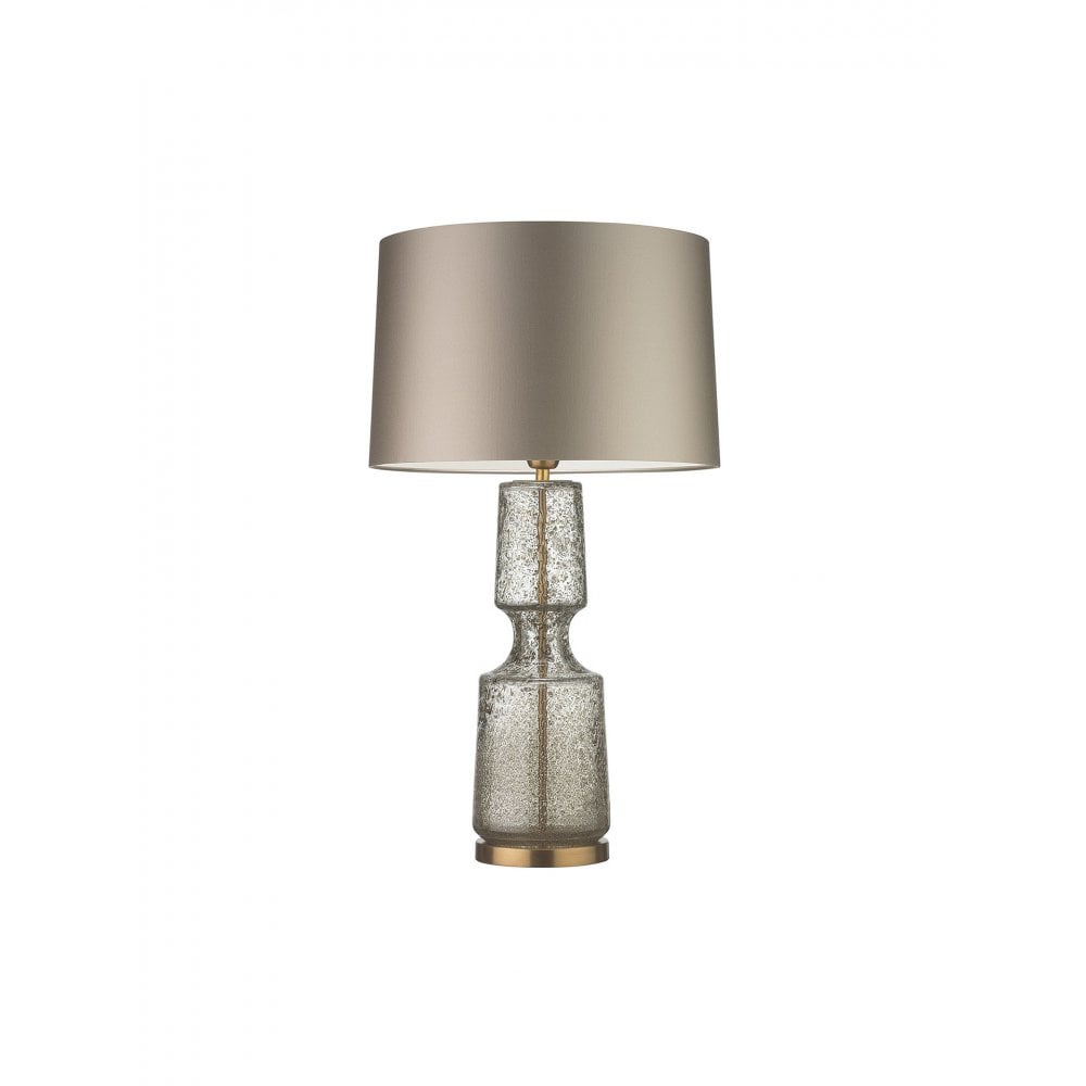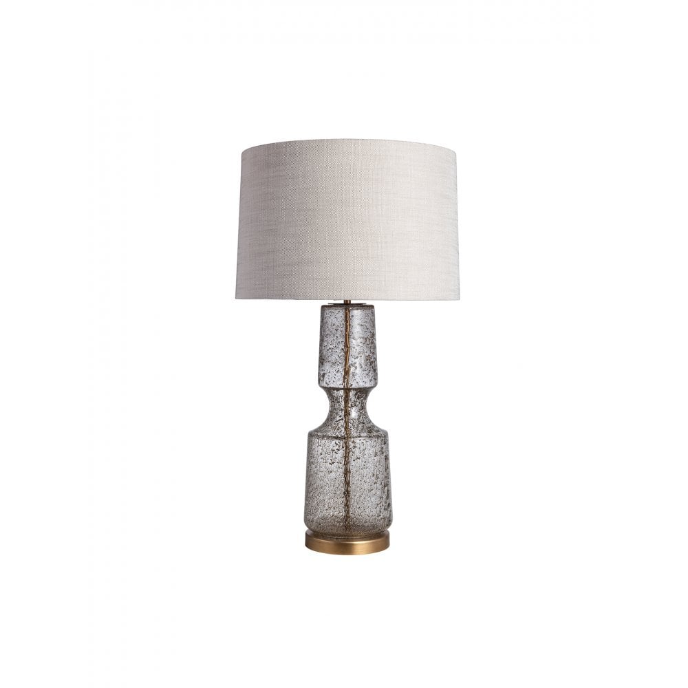 Our Antero glass table lamp features a beautifully sculpted form with a concave mid-section. The mold blown glass features bubble and frit detailing, ensuring each piece remains unique.