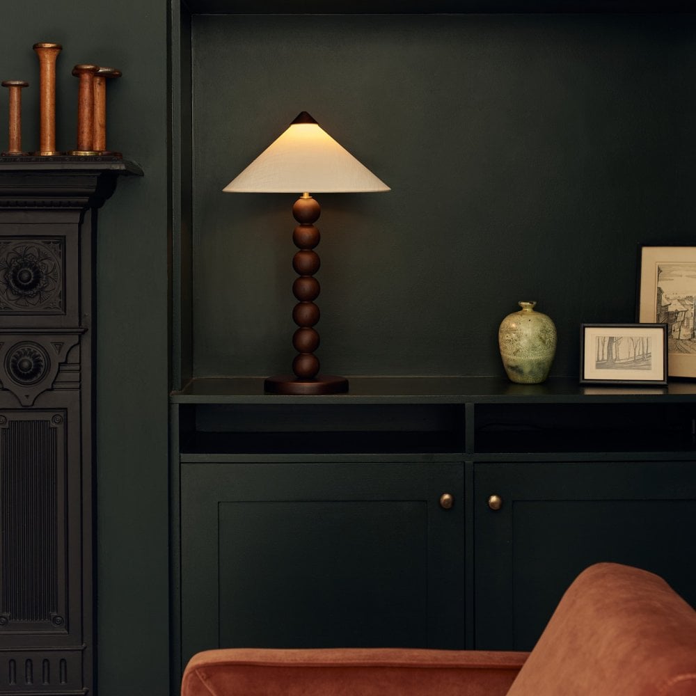 A modern twist on the classic bobbin design, Archie’s sleek and stacked silhouette is crafted from rich Smoked Oak wood. The elegant conical lampshade is also topped with a wooden cap, creating a seamless and cohesive look.