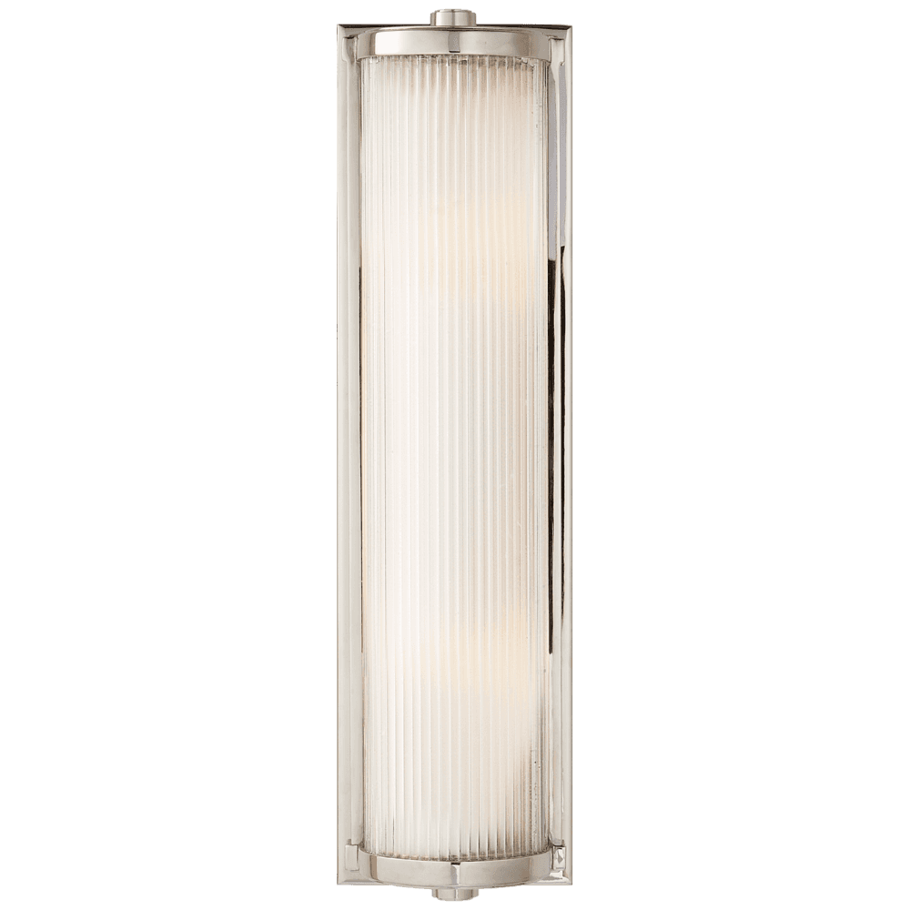 The Dresser Long Wall Light features a sleek, elongated profile with a polished nickel finish that complements its frosted glass liner and fluted glass rods. The frosted glass diffuser ensures a soft, ambient glow, while the fluted design adds texture and visual interest. This fixture is ideal for spaces where wall-mounted lighting is preferred, such as bathrooms, corridors, or as accent lighting in living areas.