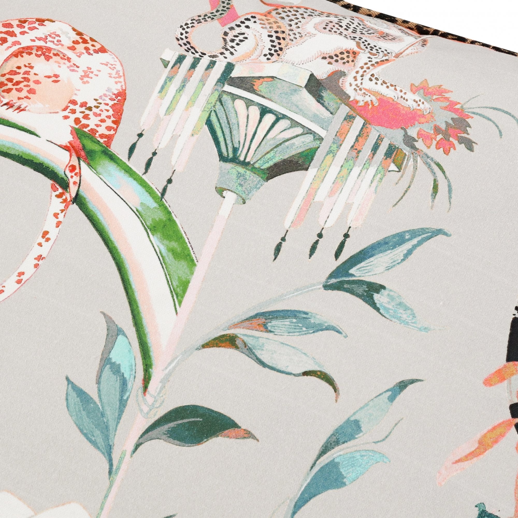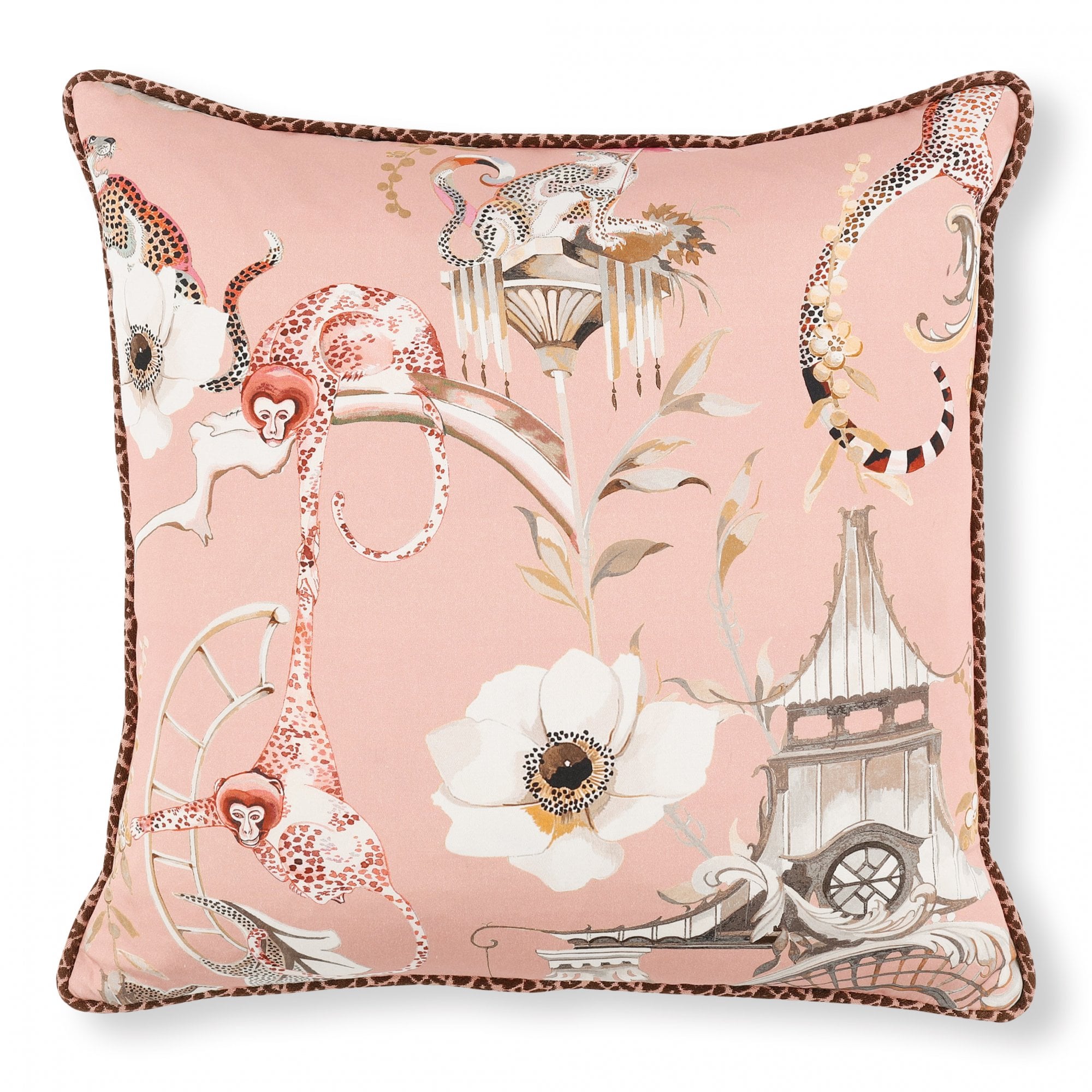 A heady cotton satin cushion with a decorative leopard braid piping that tells a story of parasol wielding leopards and mischievous, swinging monkeys in a world of chinoiserie inspired scenes.