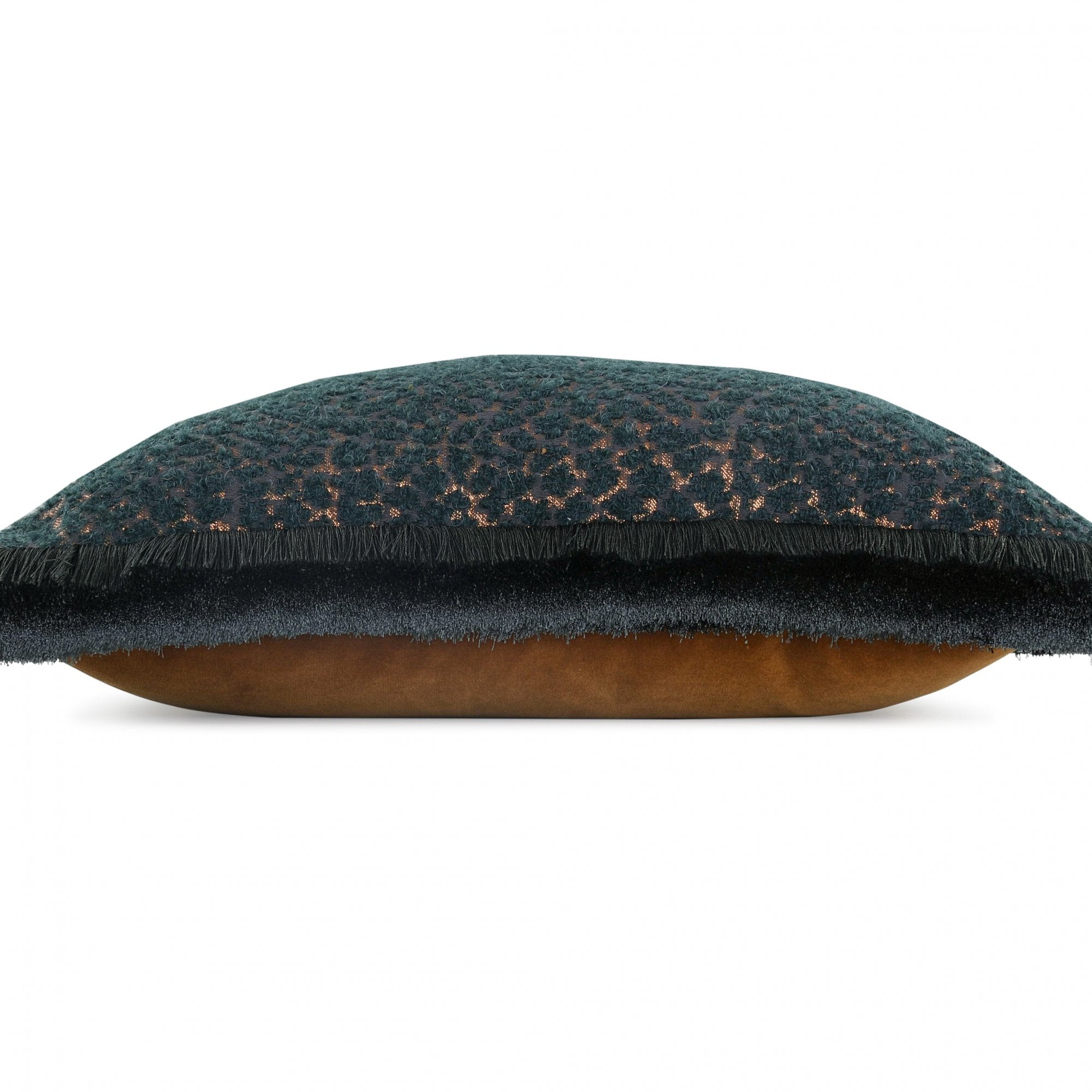 An incredibly soft, textural wool bouclé cushion with a dash of leopard vivacity and a hint of sparkly metallic, embellished by a beautiful, sumptuous cut ruche fringe.