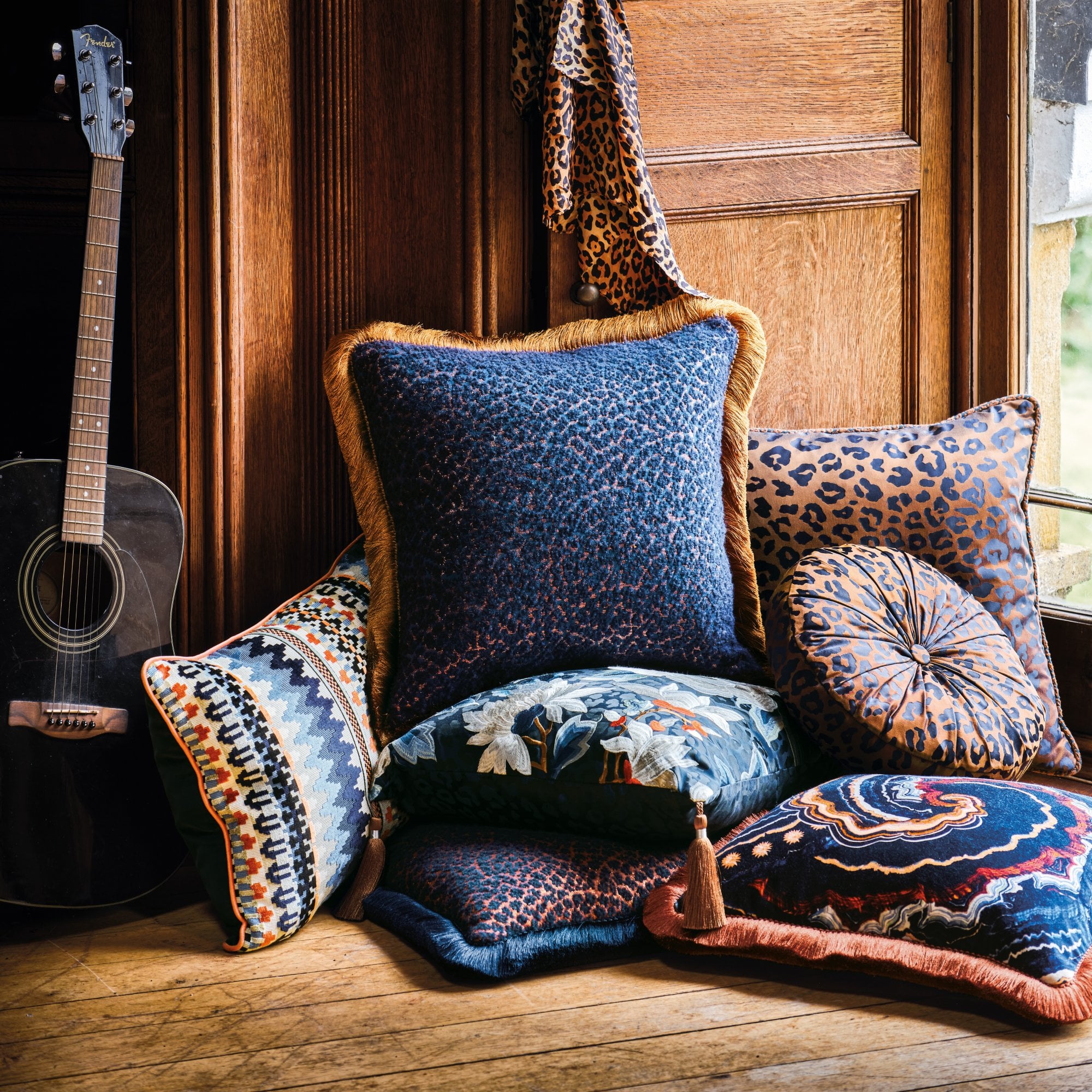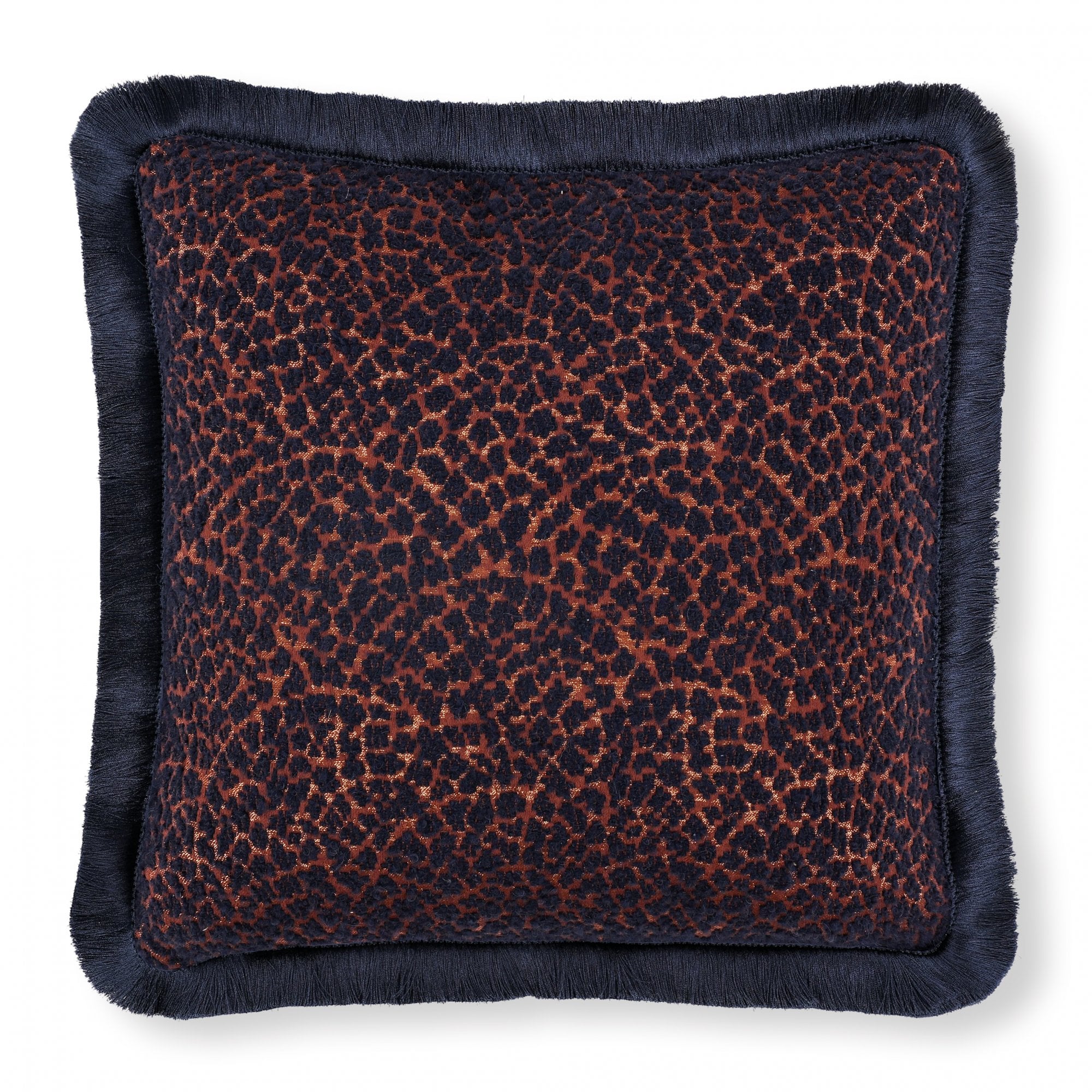 An incredibly soft, textural wool bouclé cushion with a dash of leopard vivacity and a hint of sparkly metallic, embellished by a beautiful, sumptuous cut ruche fringe.