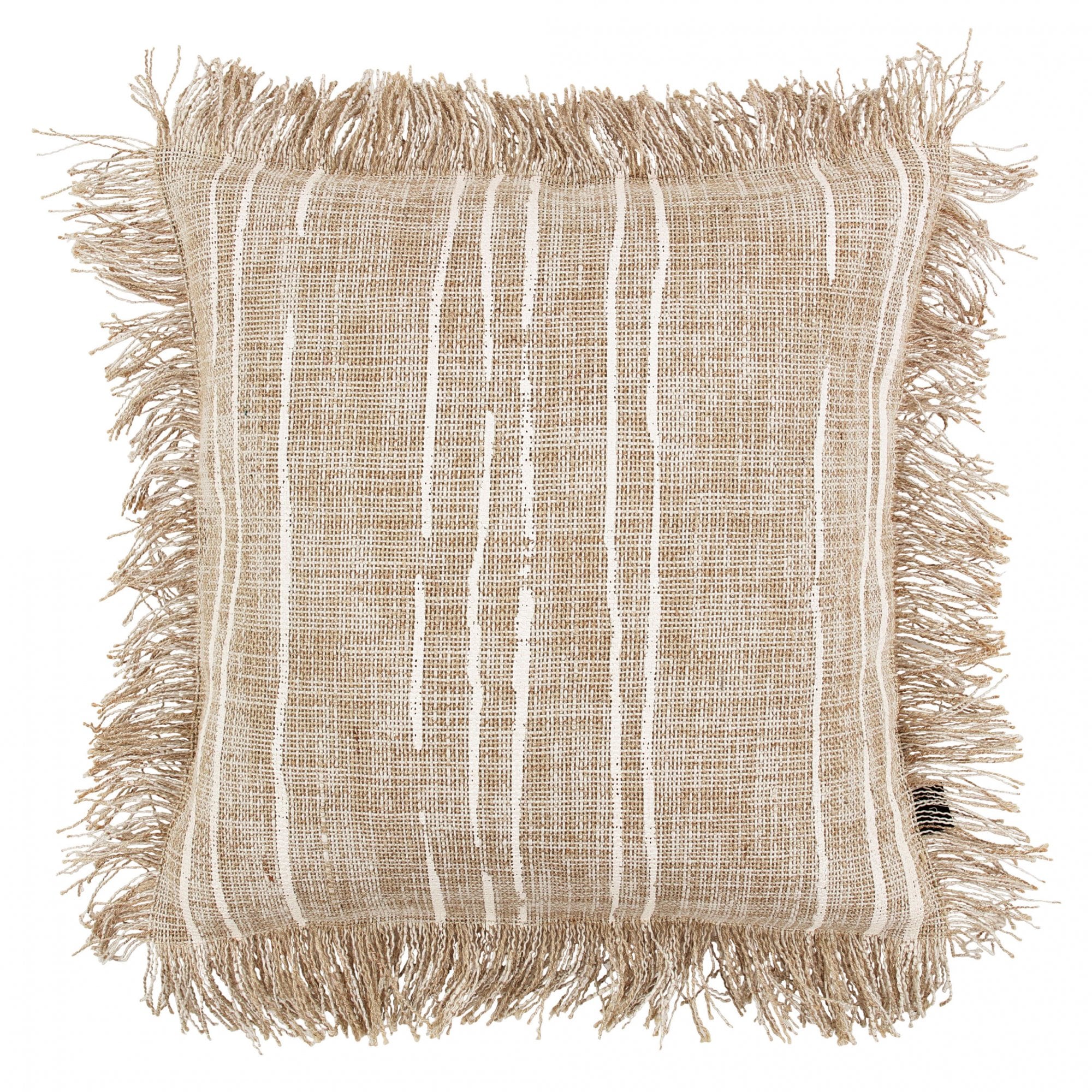 Impactful and modest, this stunning cushion features a naïve linear design screen printed on a course, open jute weave and finished with an organic frayed edge.