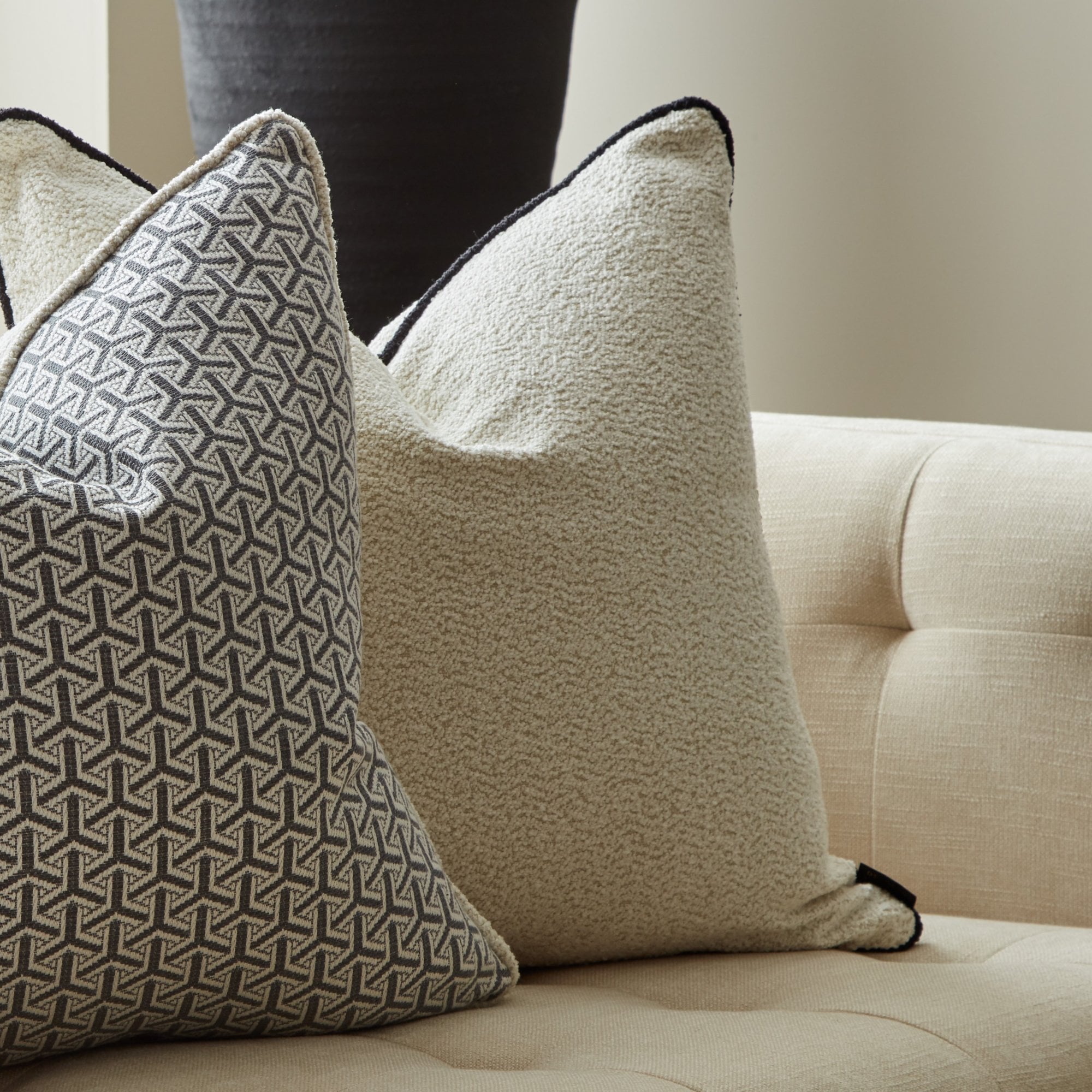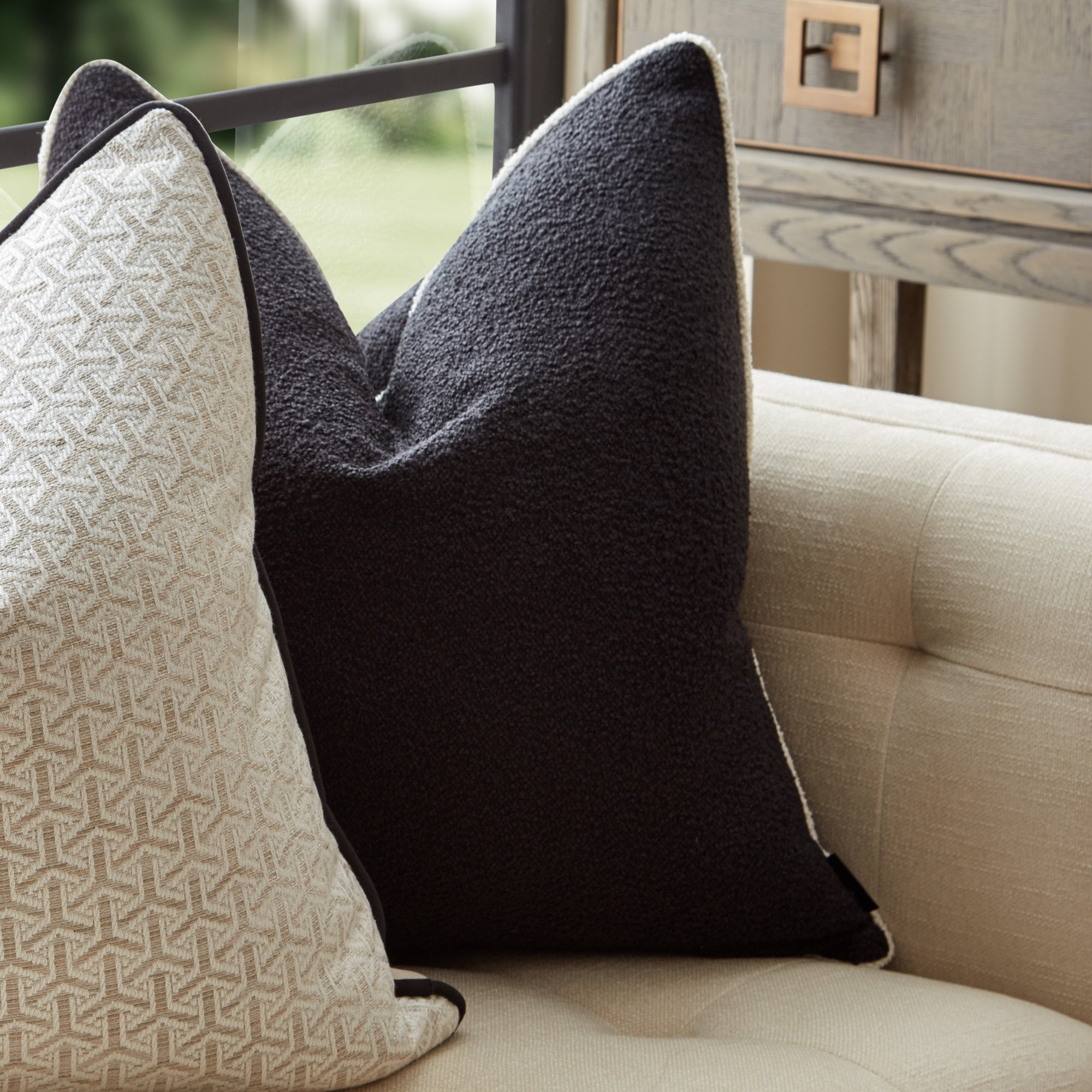 These cushions come with luxury duck feather inserts. Designer Black Bouclé fabric on front and reverse with contrast Ivory Bouclé piping. Also shown in this image is Monte String & Black Piping Cushion. The Decorum collection of cushions is an elegant and sophisticated palette that is perfect for layering with the other prints from our collection, or simply adding subtle patterns to a neutral scheme.