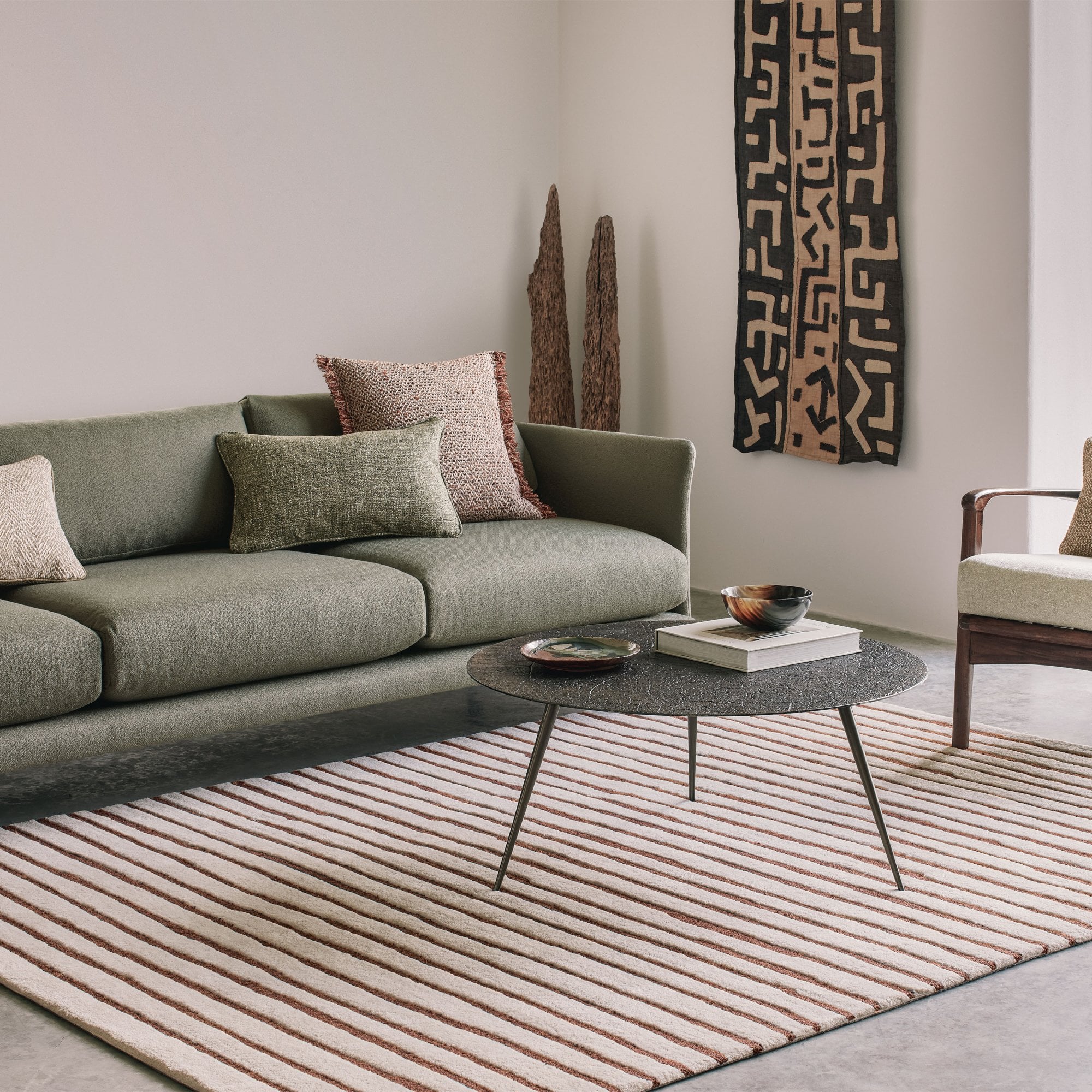 A luxuriously deep, cut and uncut pile of organic stripes create a graphic design full of character and texture. Celebrating craftmanship, the rug is hand tufted from natural wool and hand carved creating additional depth and dimension.